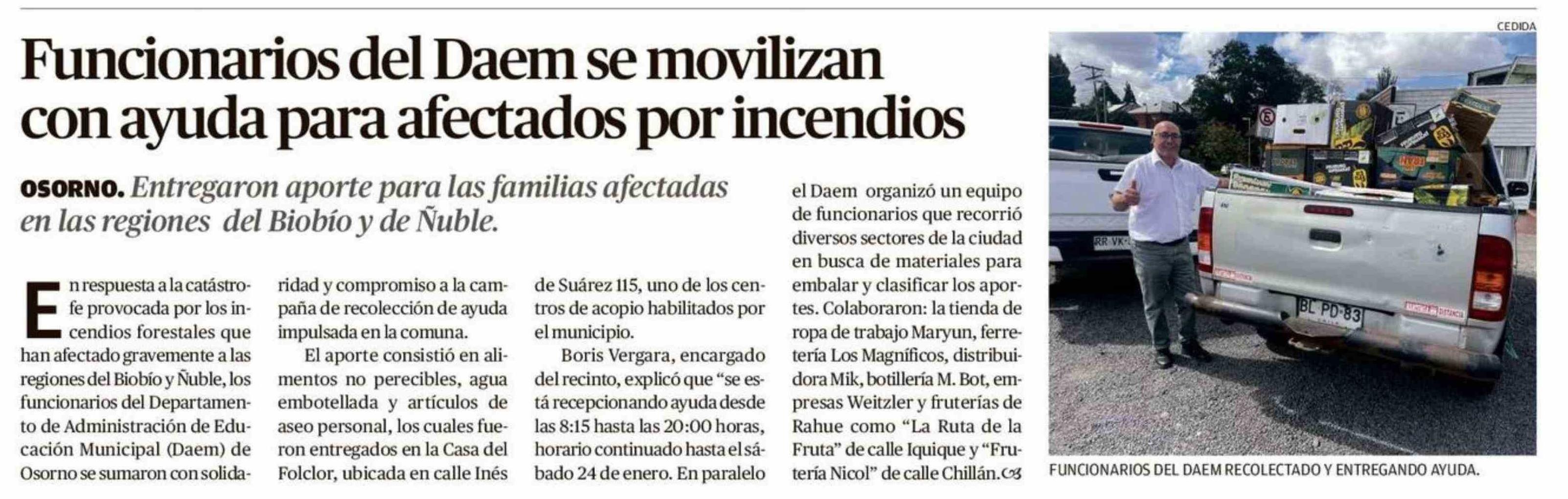 Título: Funcionarios del Daem se movilizan con ayuda para afectados por incendios