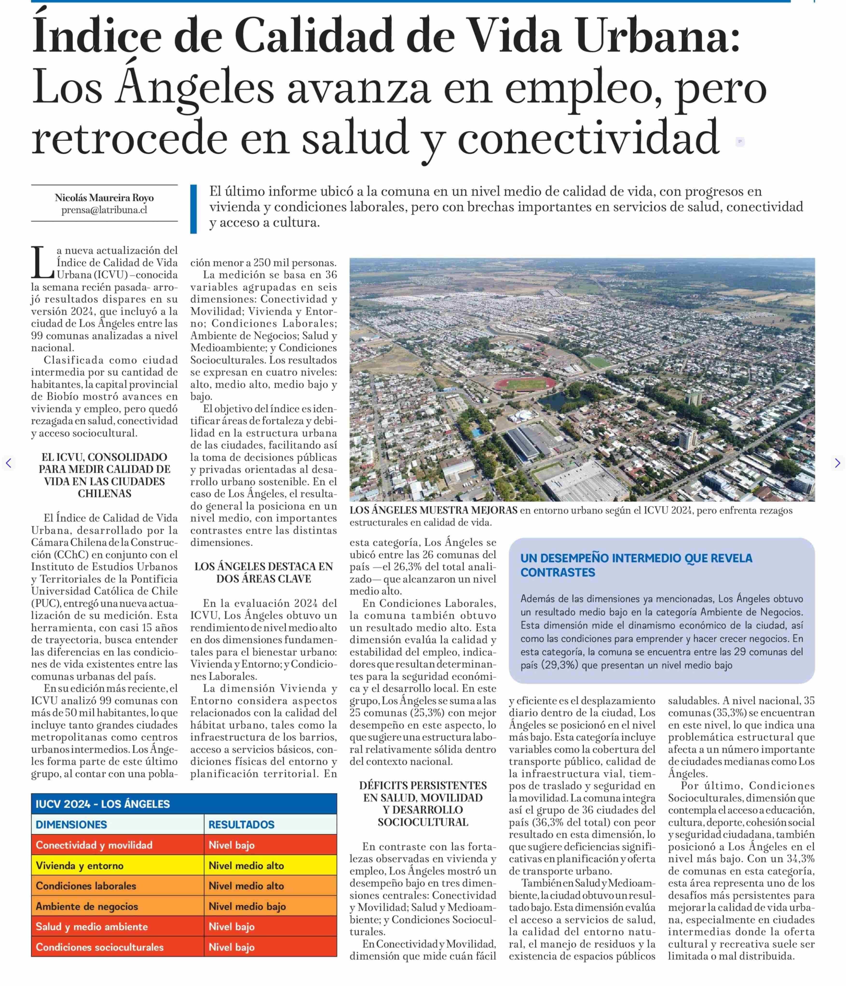 Índice de Calidad de Vida Urbana: Los Angeles avanza en empleo, pero retrocede en salud y conectividad 06-05-2025 La Tribuna |