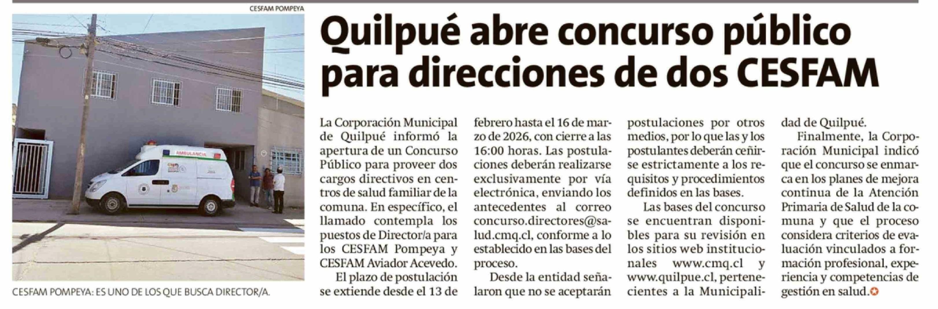 | Título: | Quilpué abre concurso público para direcciones de dos CESFAM |