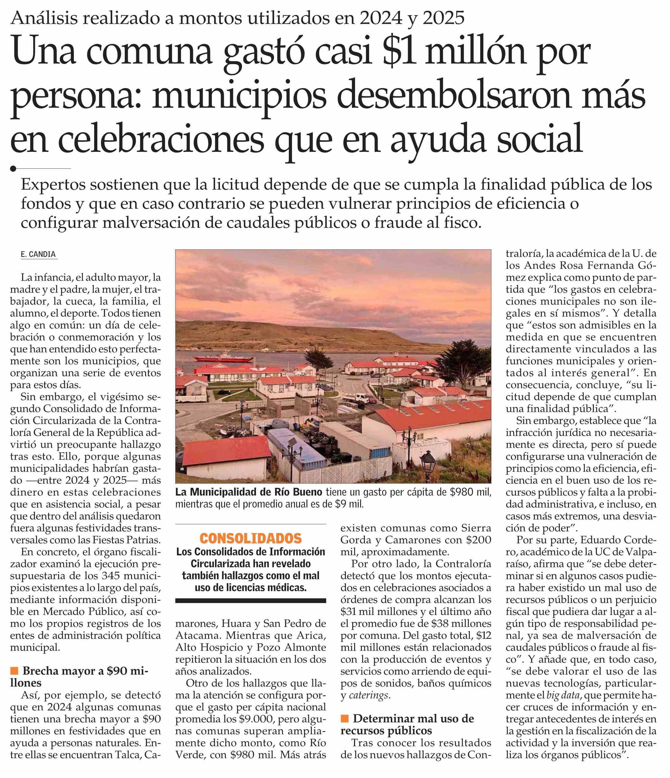 Una comuna gastó casi $1 millón por persona: municipios desembolsaron más en celebraciones que en ayuda social 07-04-2026 El Mercurio |