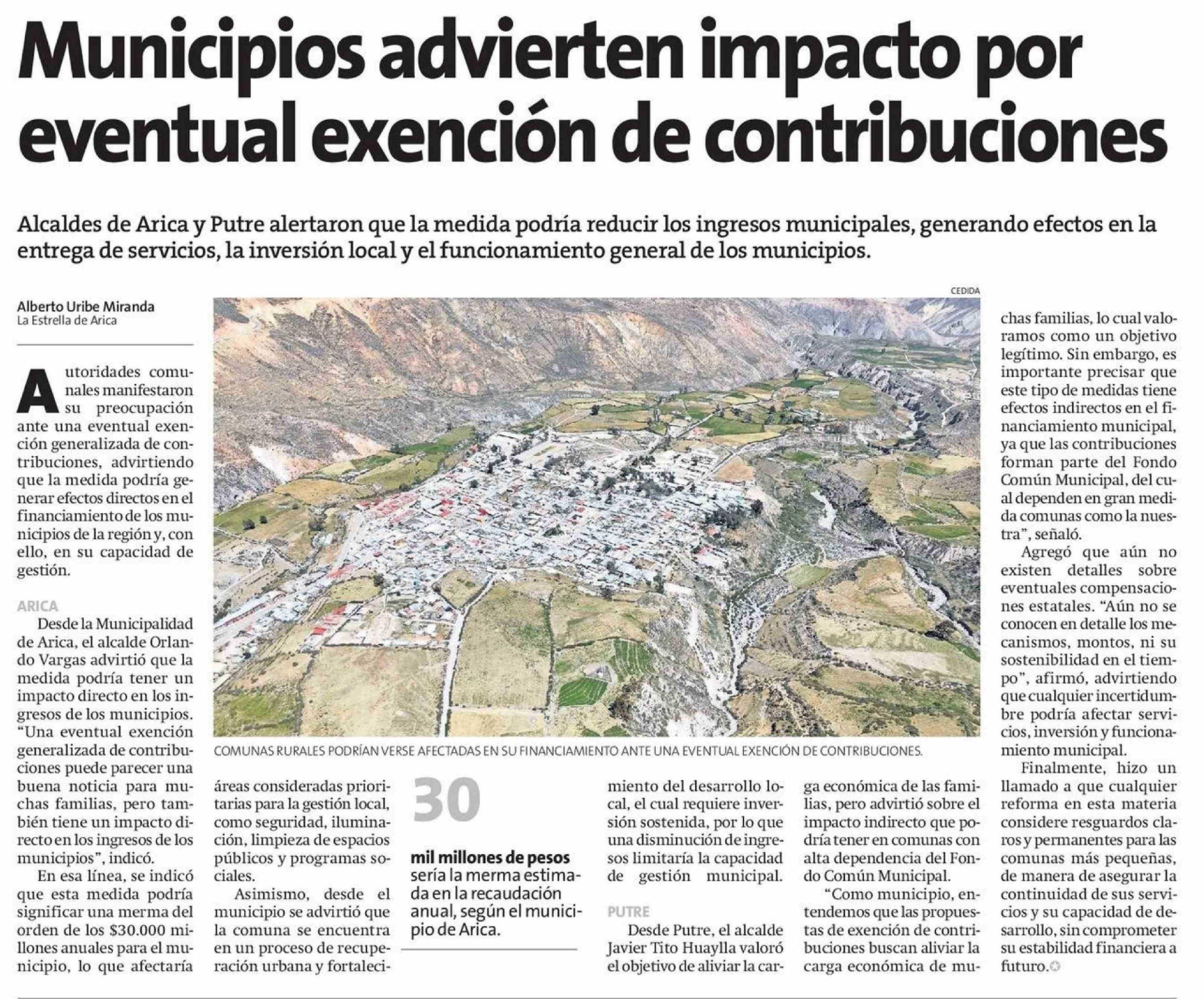Municipios advierten impacto por eventual exención de contribuciones 21-04-2026 La Estrella de Arica |