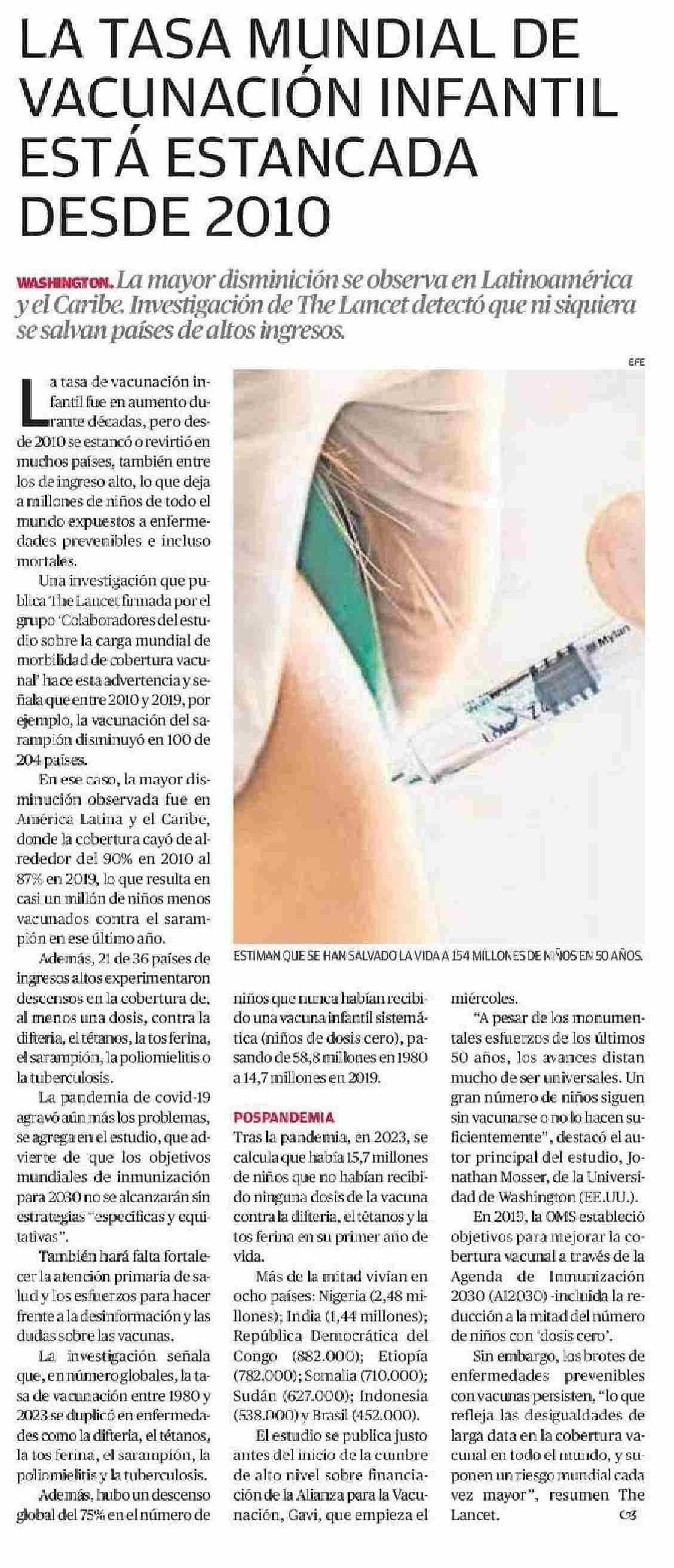 LA TASA MUNDIAL DE VACUNACIÓN INFANTIL ESTA ESTANCADA DESDE 2010 26-06-2025 El Mercurio de Calama |