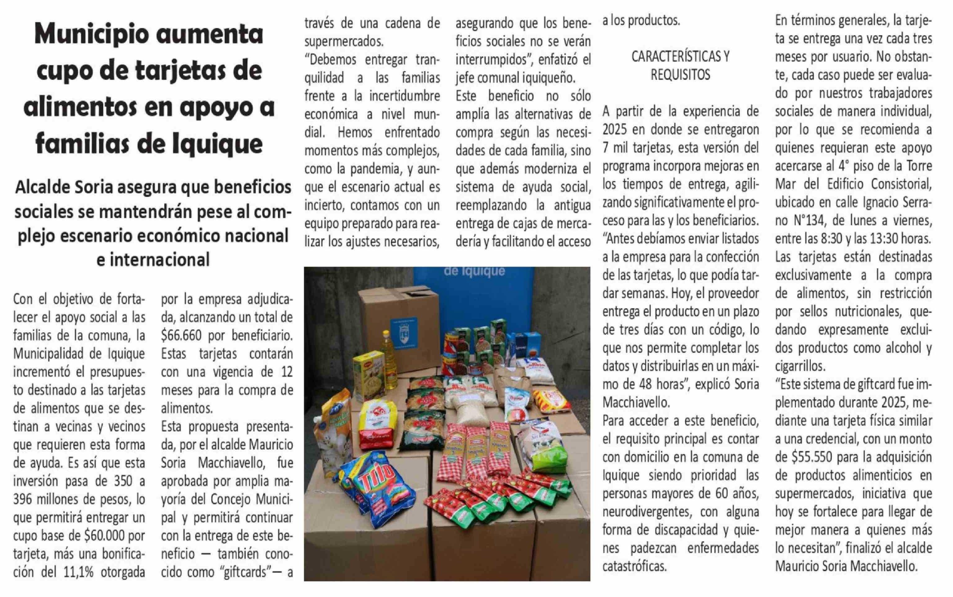 | Título: | Municipio aumenta cupo de tarjetas de alimentos en apoyo a familias de Iquique |