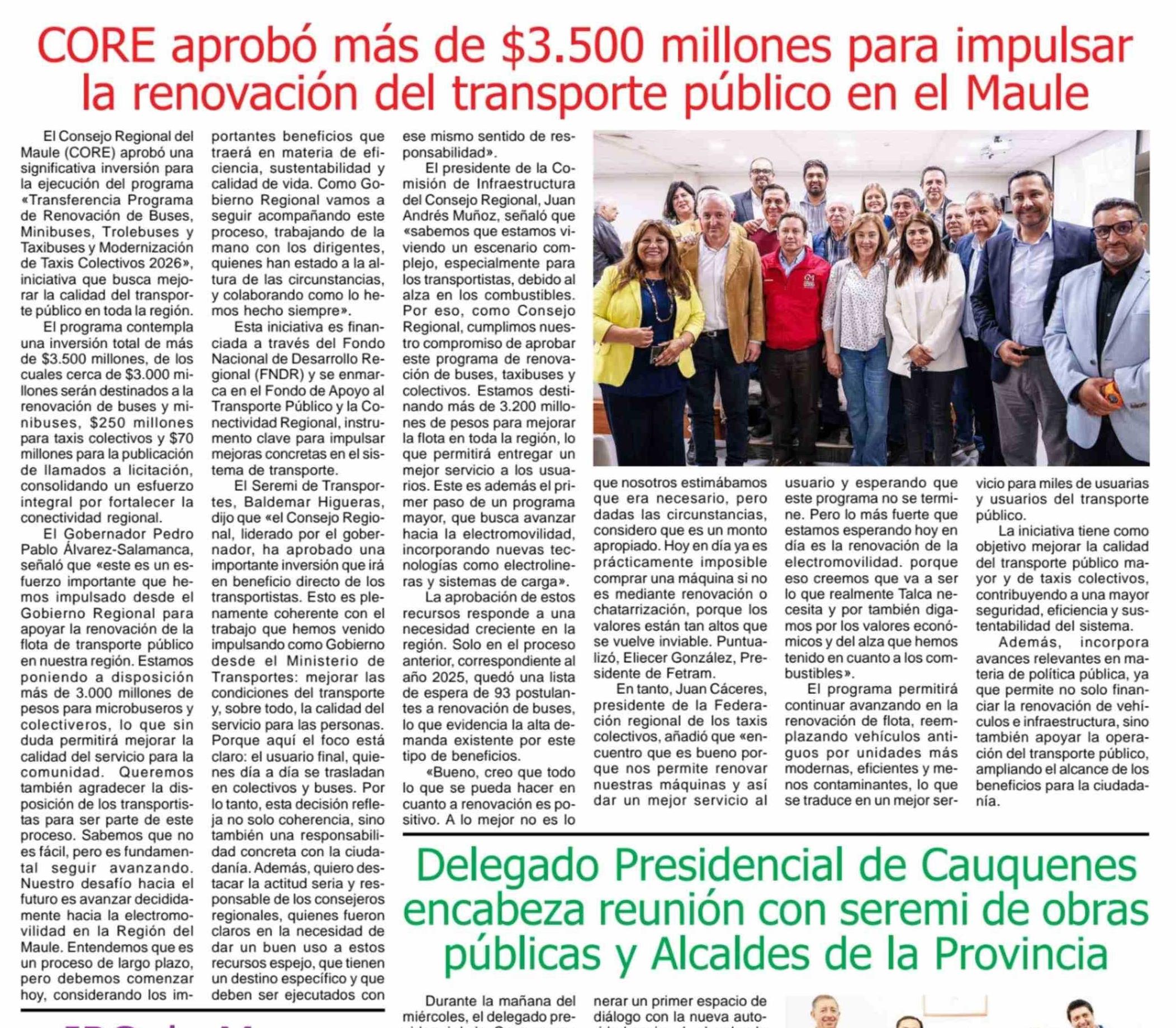 CORE aprobó más de $3.500 millones para impulsar la renovación del transporte público en el Maule 09-04-2026 Maule Hoy |
