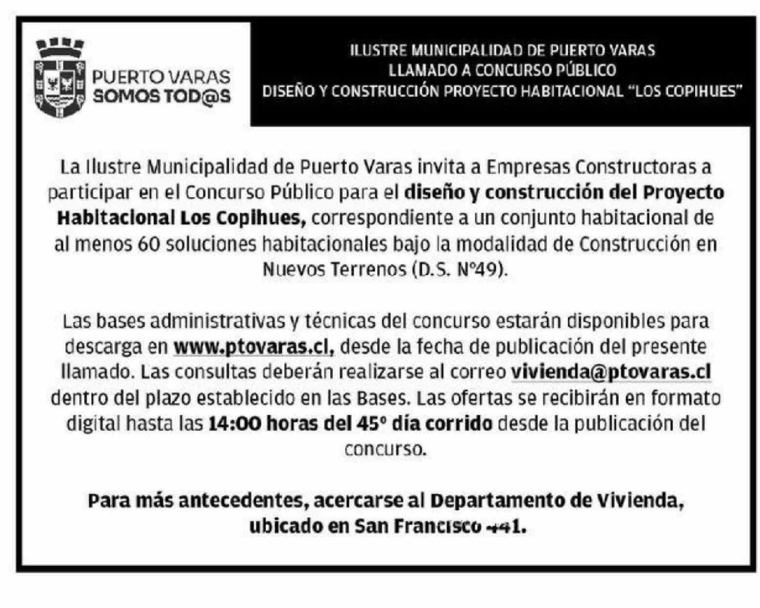 AVISO LICITACIONES: ILUSTRE MUNICIPALIDAD DE PUERTO VARAS LLAMADO A CONCURSO PÚBLICO DISEÑO Y CONSTRUCCIÓN PROYECTO HABITACIONAL “LOS COPIHUES” 21-04-2026 El Llanquihue |