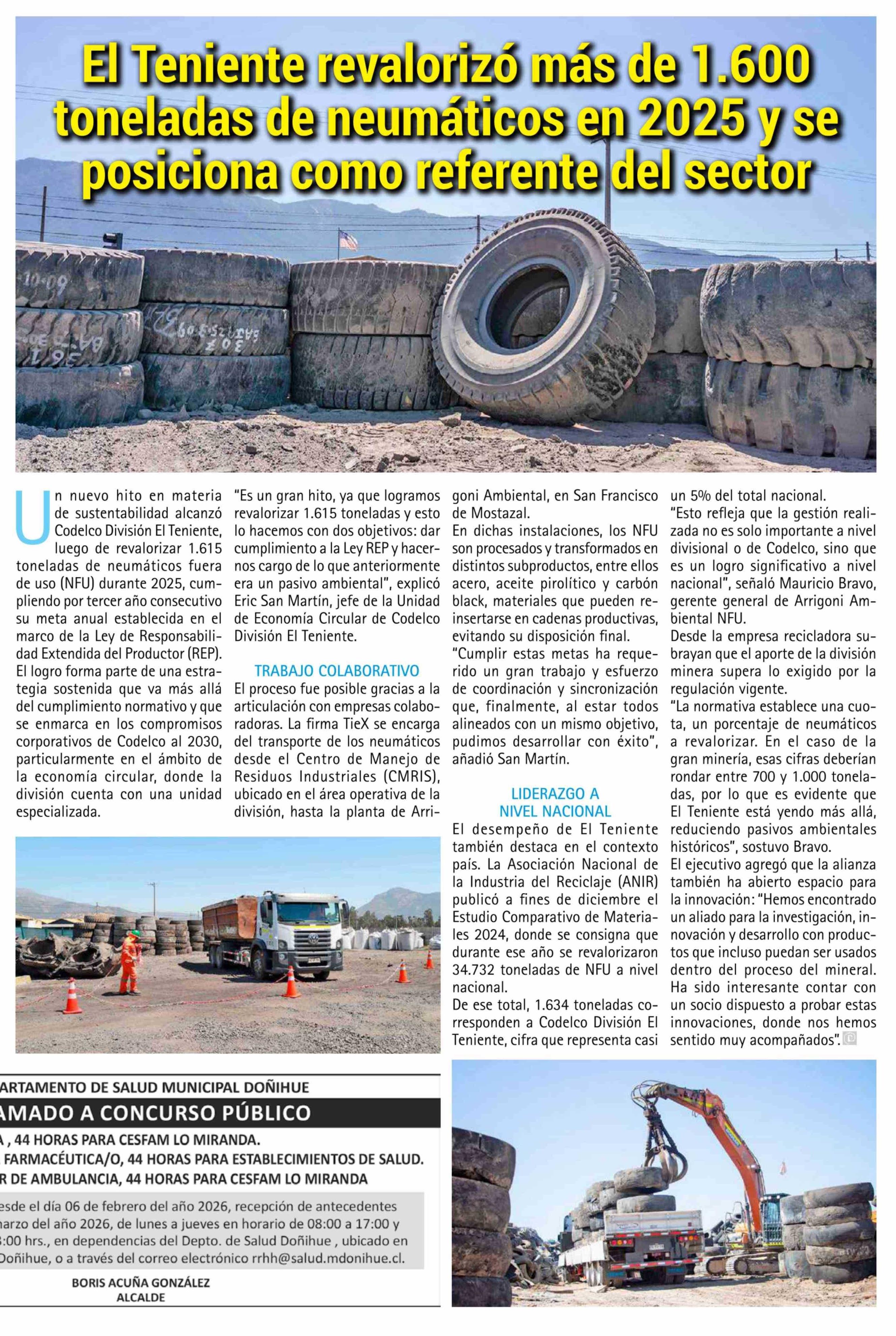 El Teniente revalorizó más de 1.600 toneladas de neumáticos en 2025 y se posiciona como referente del sector 05-02-2026 El Rancagüino |