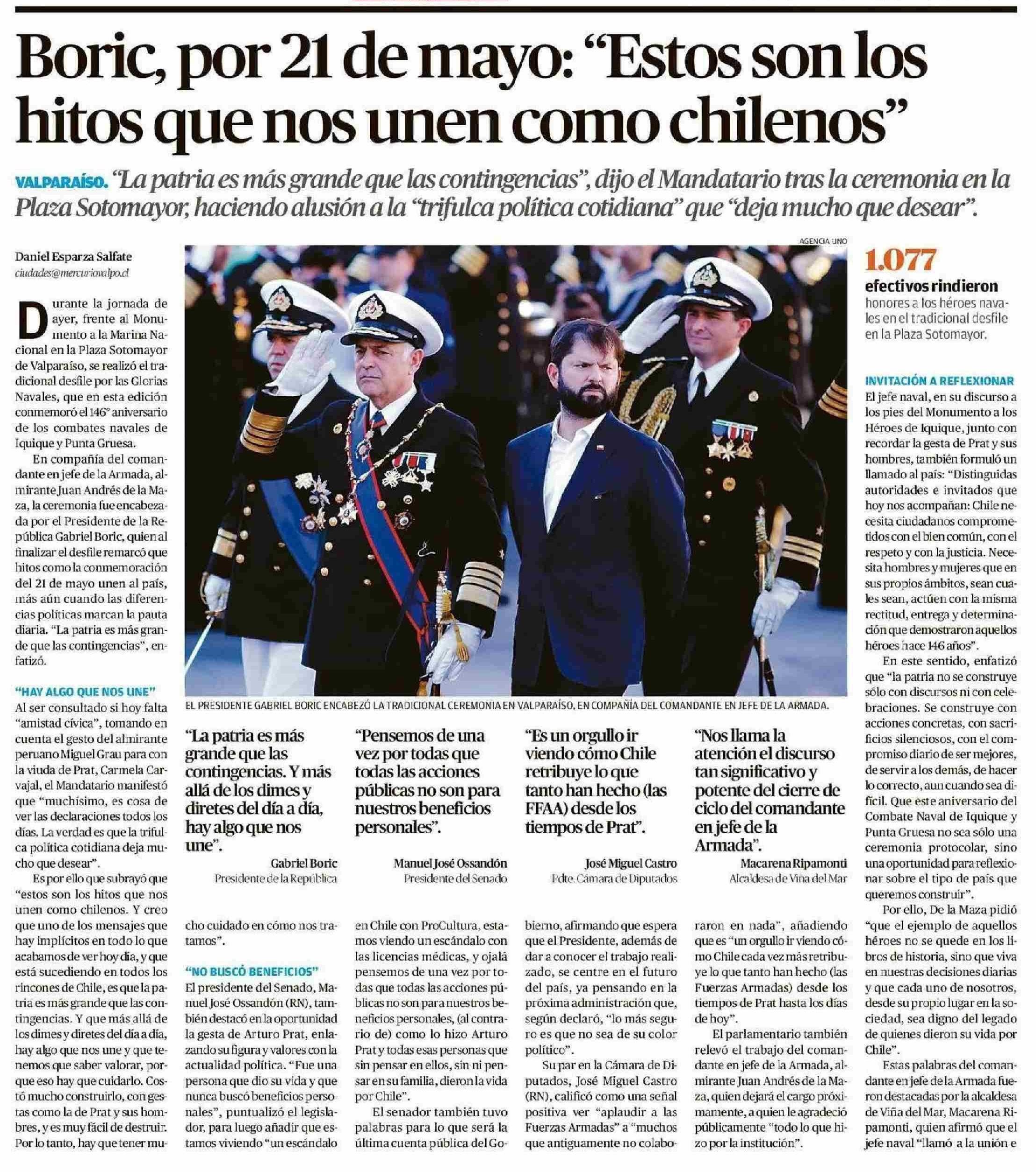 Boric, por 21 de mayo: “Estos son los hitos que nos unen como chilenos” 22-05-2025 El Mercurio de Valparaíso |