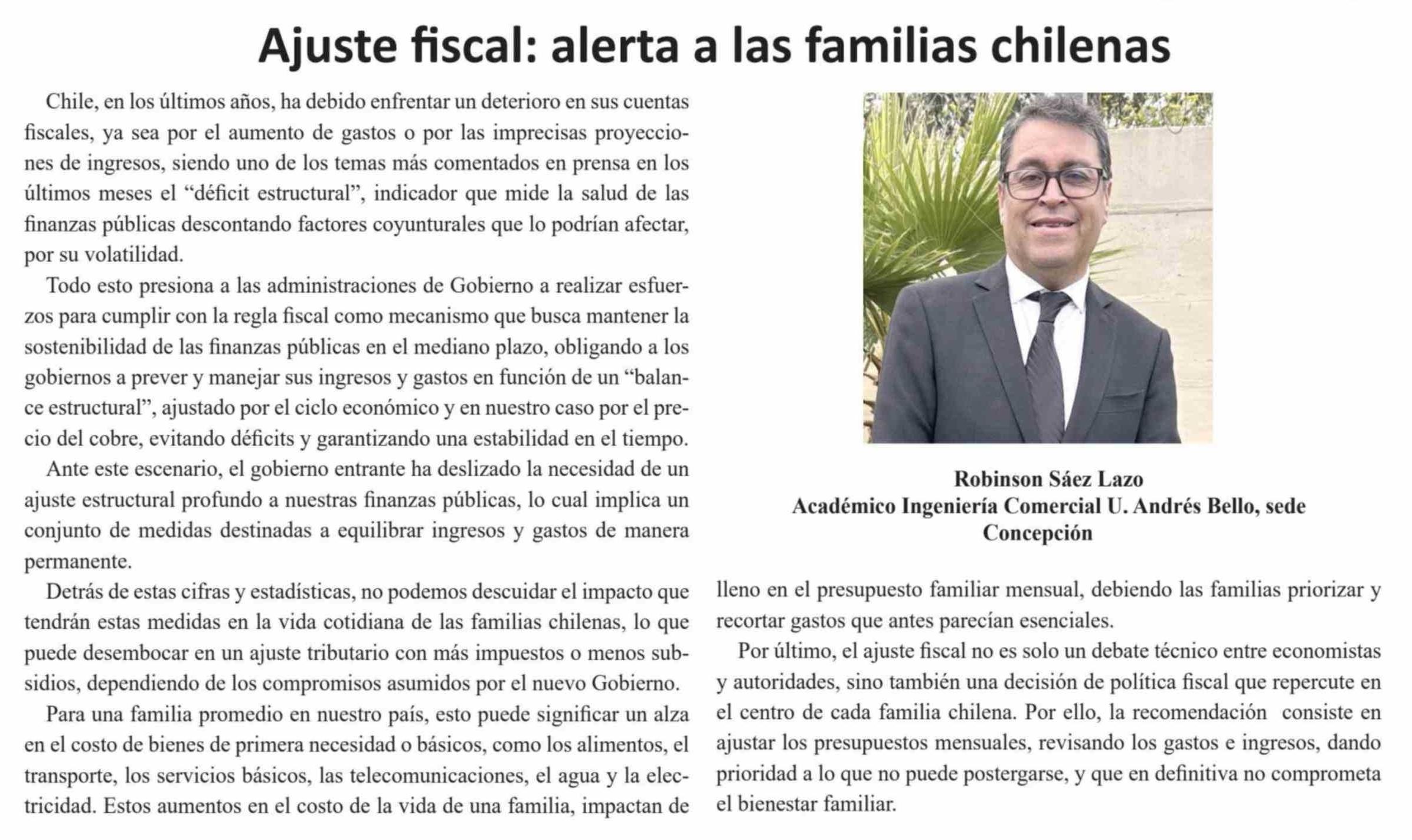 | Título: | Columnas de Opinión: Ajuste fiscal: alerta a las familias chilenas |