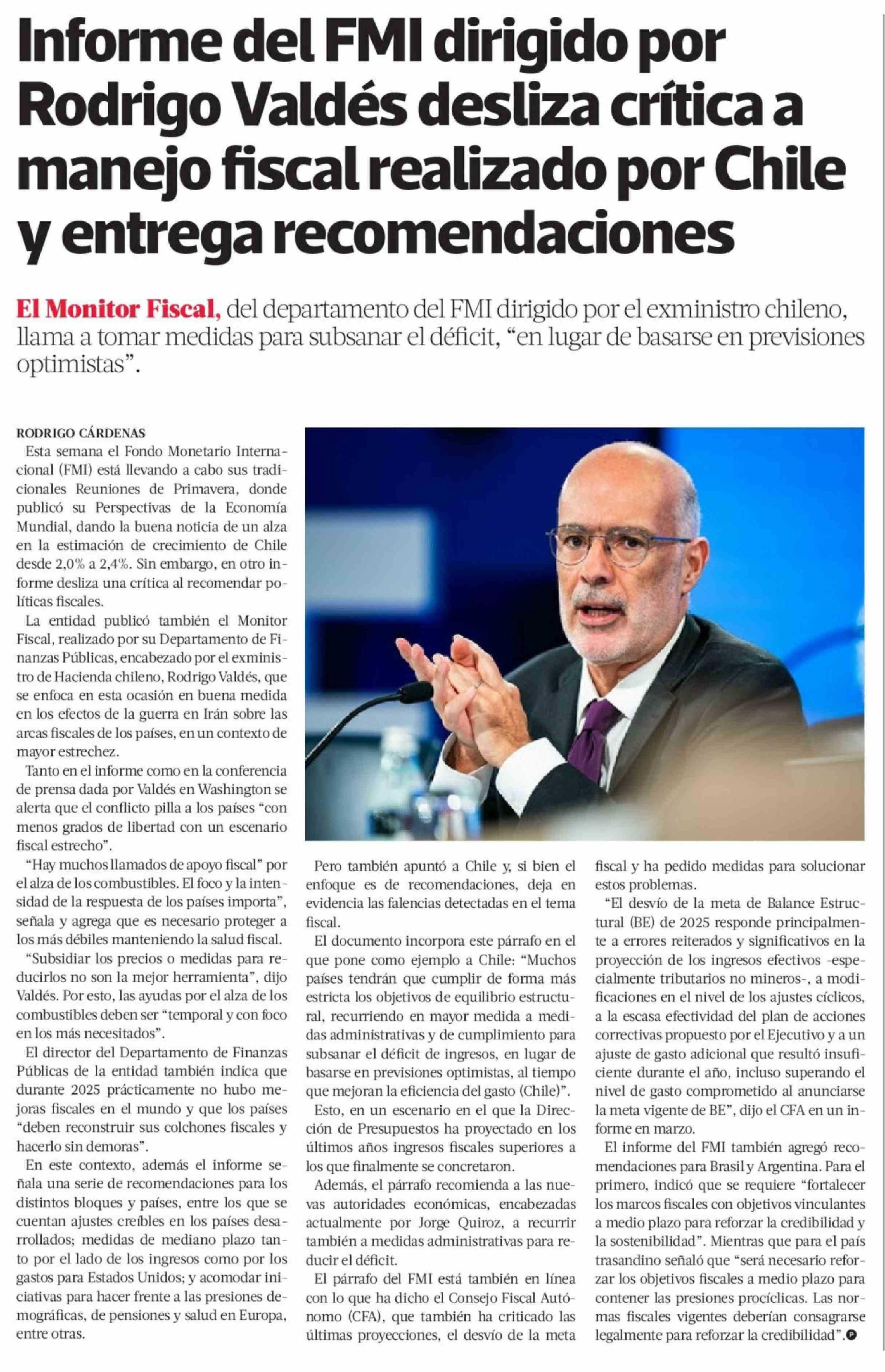 Informe del FMI dirigido por Rodrigo Valdés desliza crítica a manejo fiscal realizado por Chile y entrega recomendaciones 17-04-2026 La Tercera |
