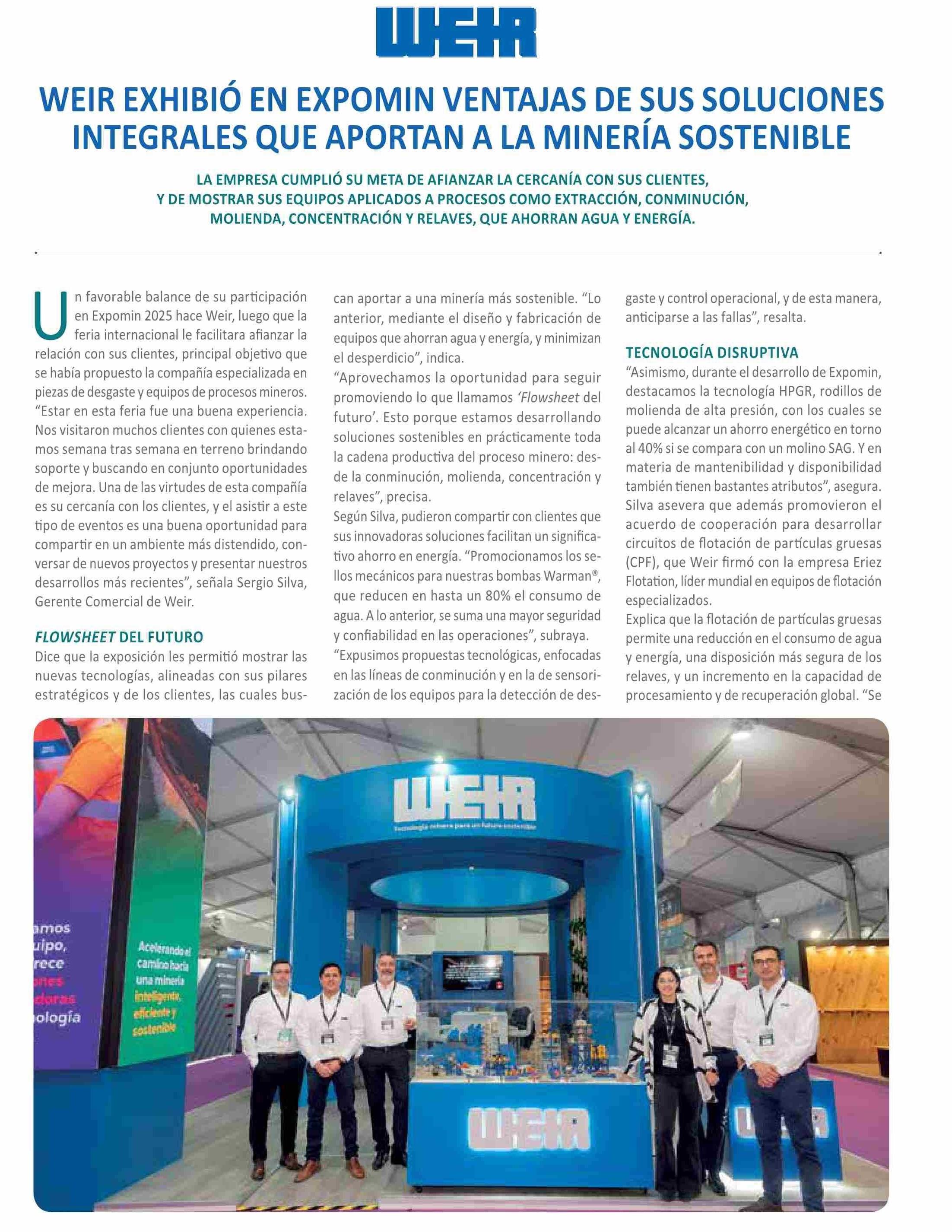 WEIR EXHIBIÓ EN EXPOMIN VENTAJAS DE SUS SOLUCIONES INTEGRALES QUE APORTAN A LA MINERÍA SOSTENIBLE 27-05-2025 Revista Minería Chilena |
