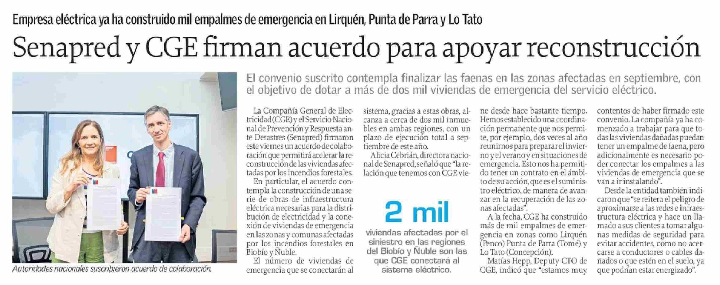 Senapred y CGE firman acuerdo para apoyar reconstrucción 07-02-2026 El Sur |