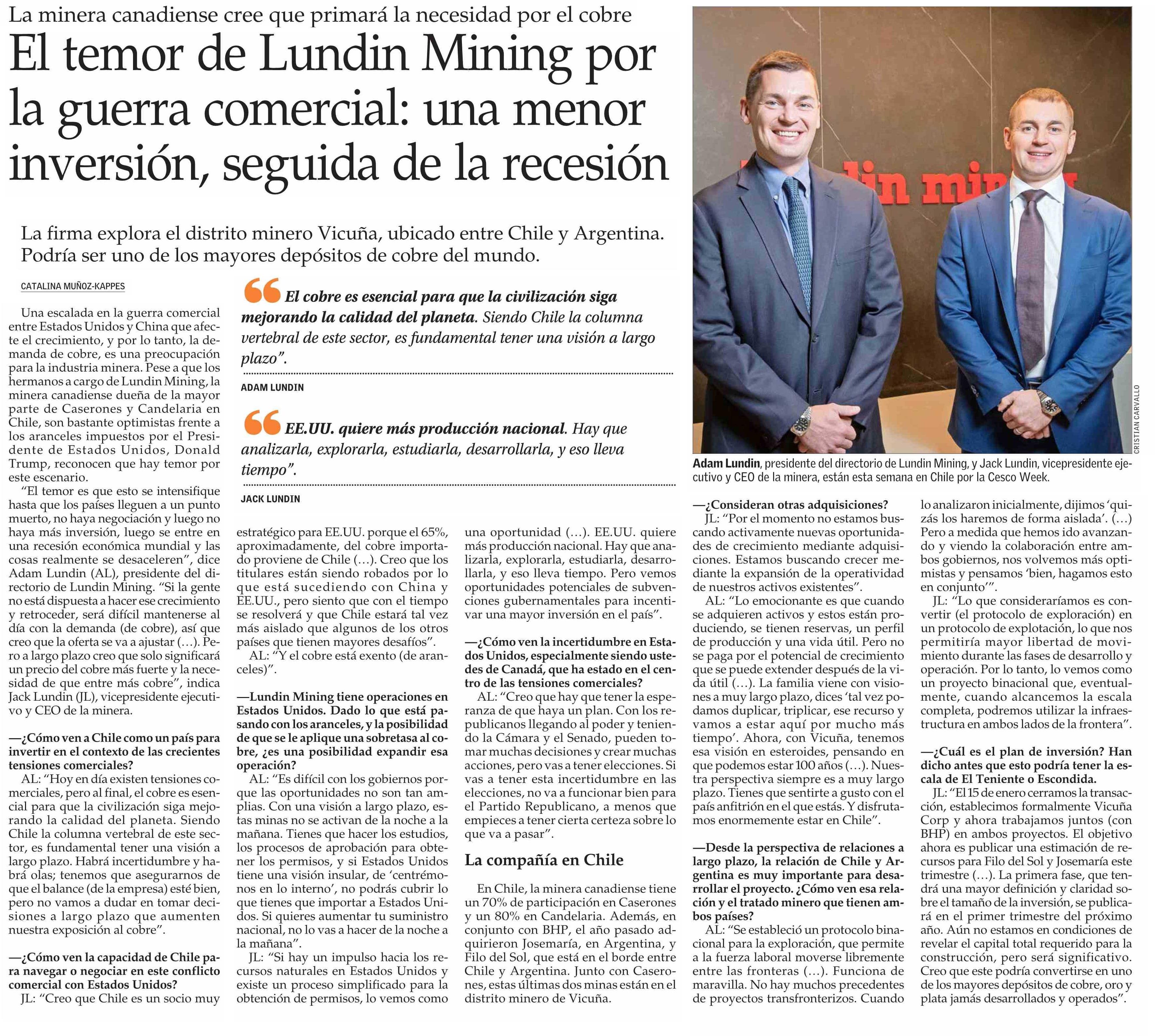 El temor de Lundin Mining por la guerra comercial: menor inversión, seguida de la recesión 10-04-2025 El Mercurio |