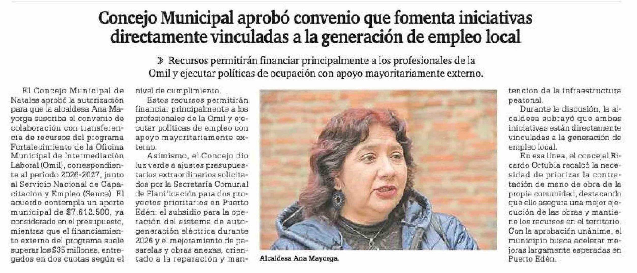 Concejo Municipal aprobó convenio que fomenta iniciativas directamente vinculadas a la generación de empleo local 21-01-2026 La Prensa Austral |