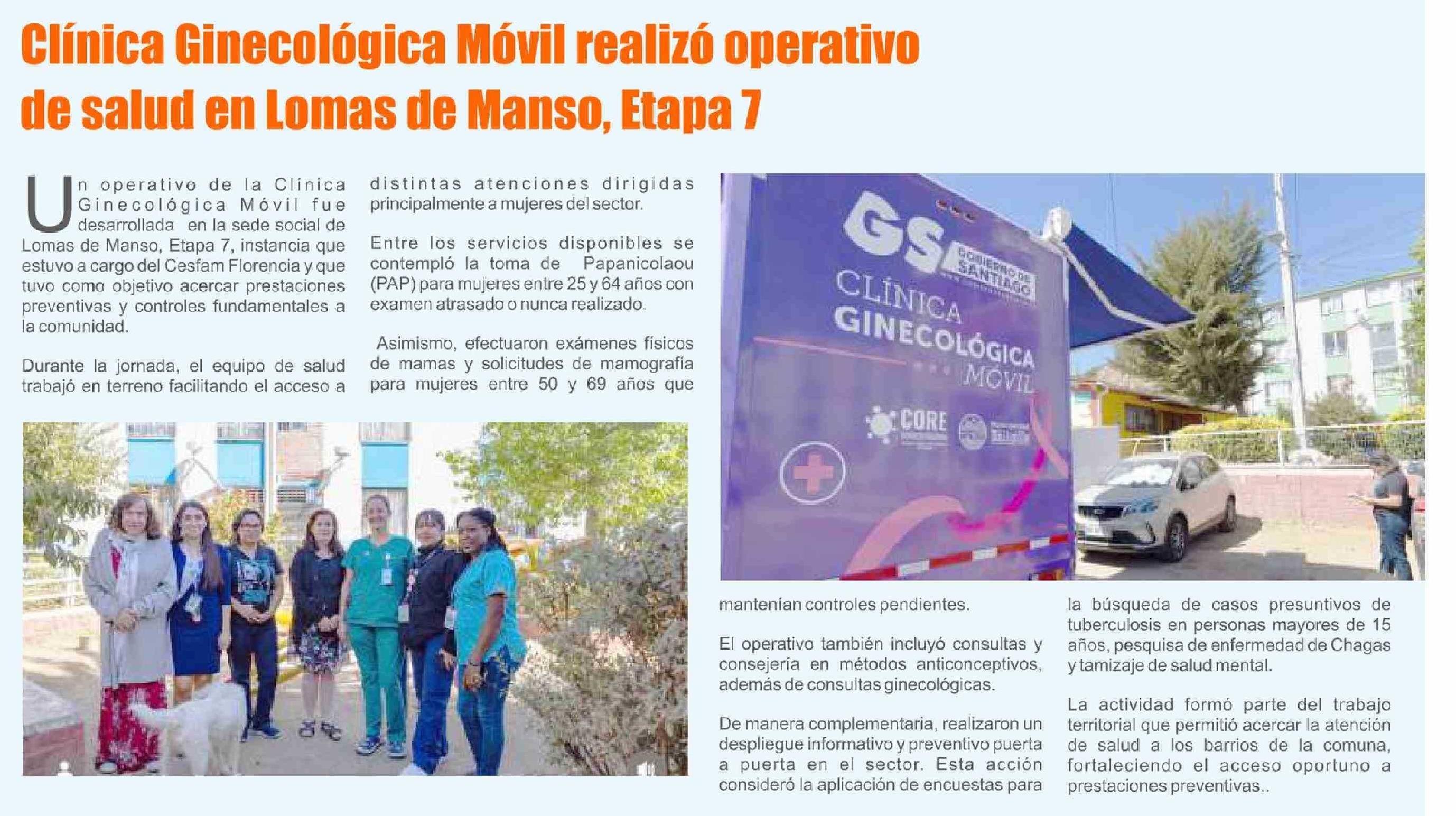 Título: Clínica Ginecológica Móvil realizó operativo de salud en Lomas de Manso, Etapa 7