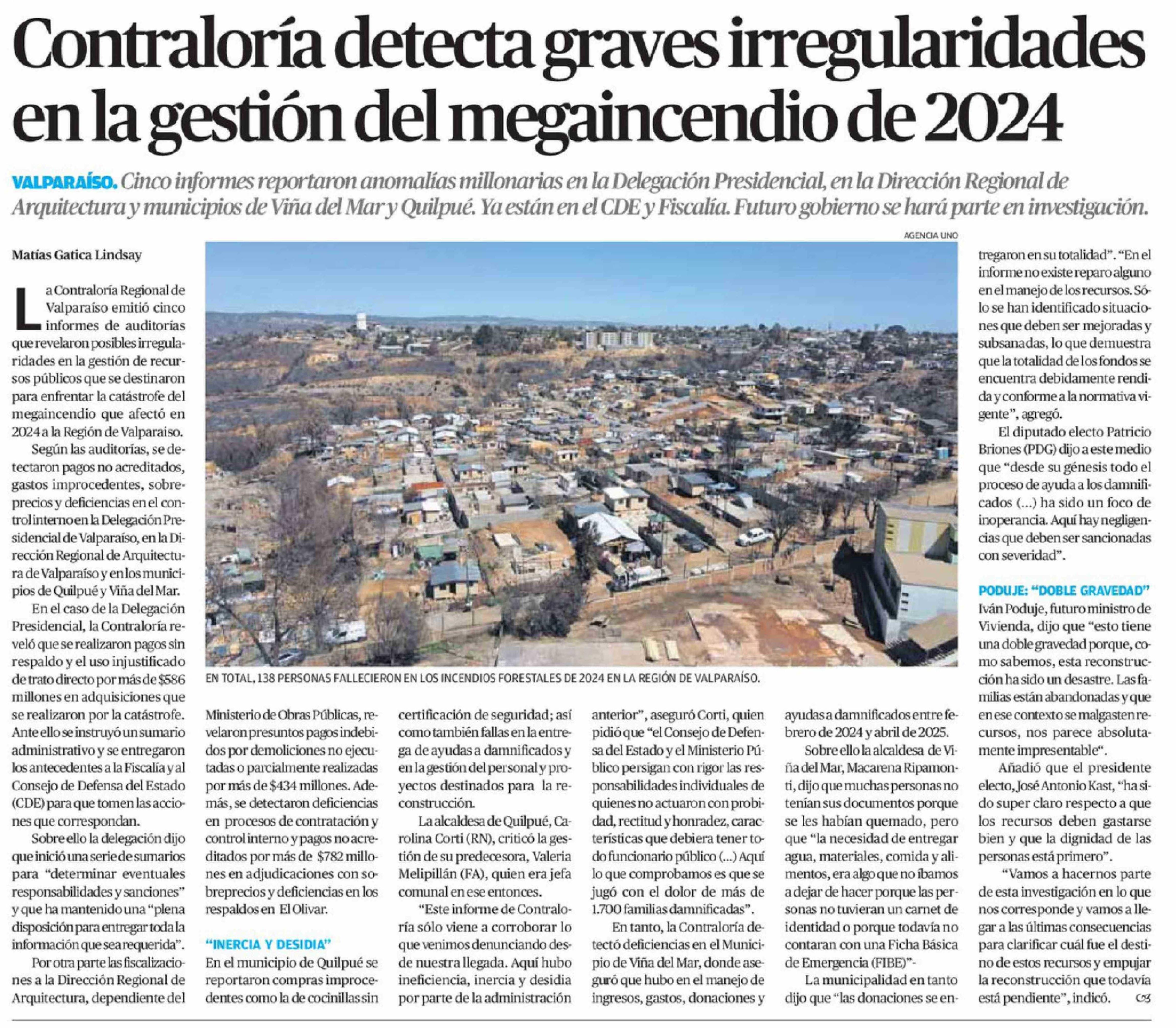 Contraloría detecta graves irregularidades en la gestión del megaincendio de 2024 11-02-2026 El Mercurio de Calama |