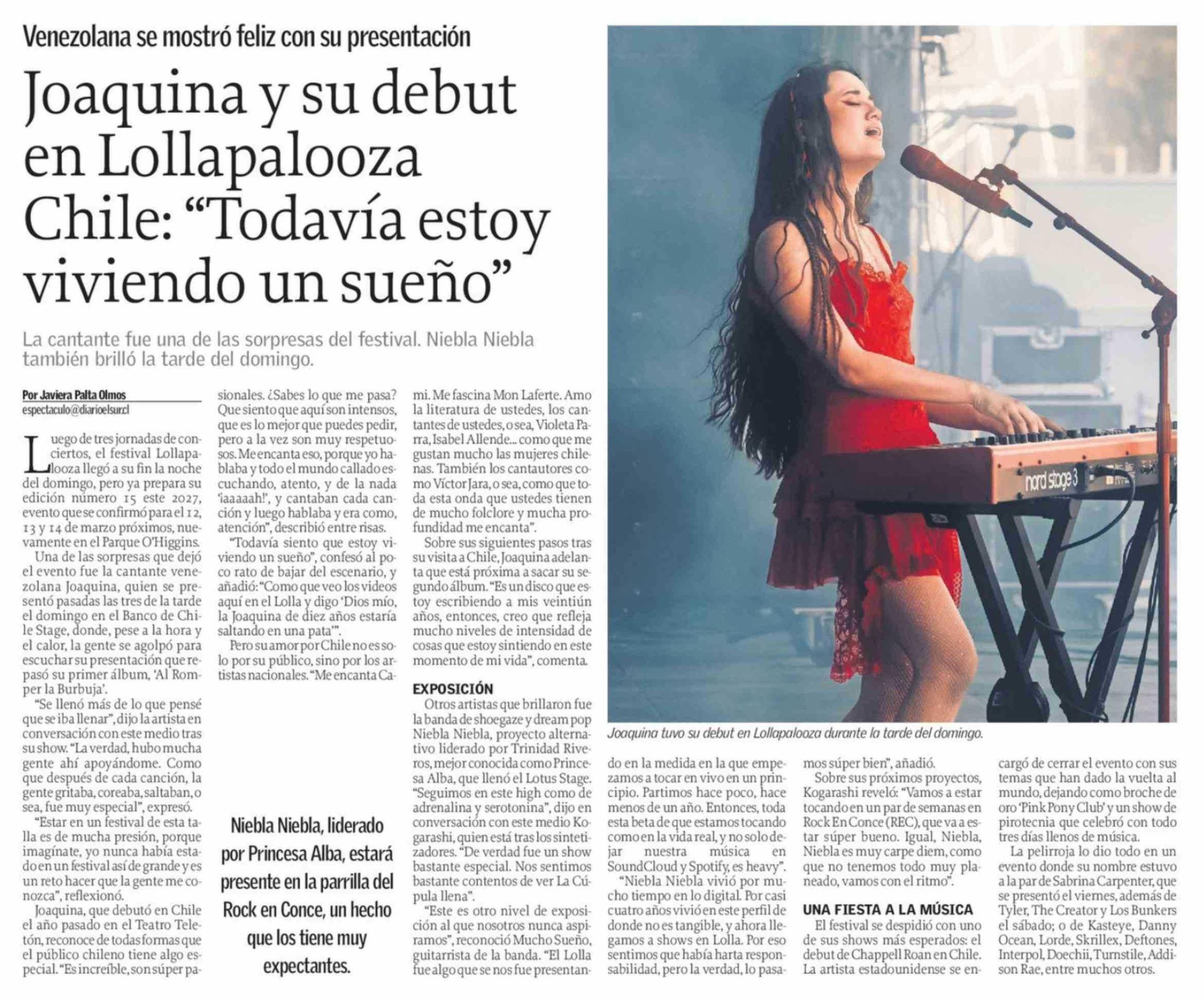 Joaquina y su debut en Lollapalooza Chile: "Todavía estoy viviendo un sueño" 17-03-2026 El Sur |