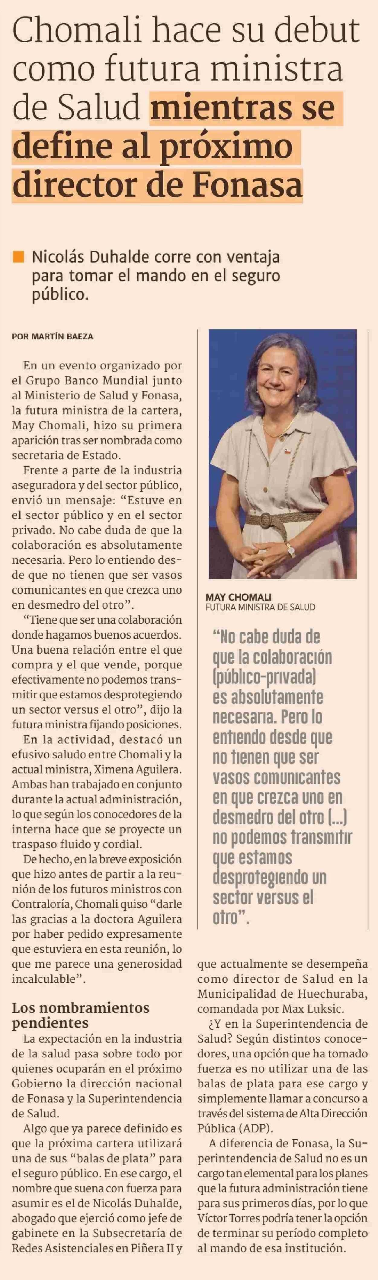 Chomali hace su debut como futura ministra de Salud mientras se define al próximo director de Fonasa 27-01-2026 Diario Financiero |