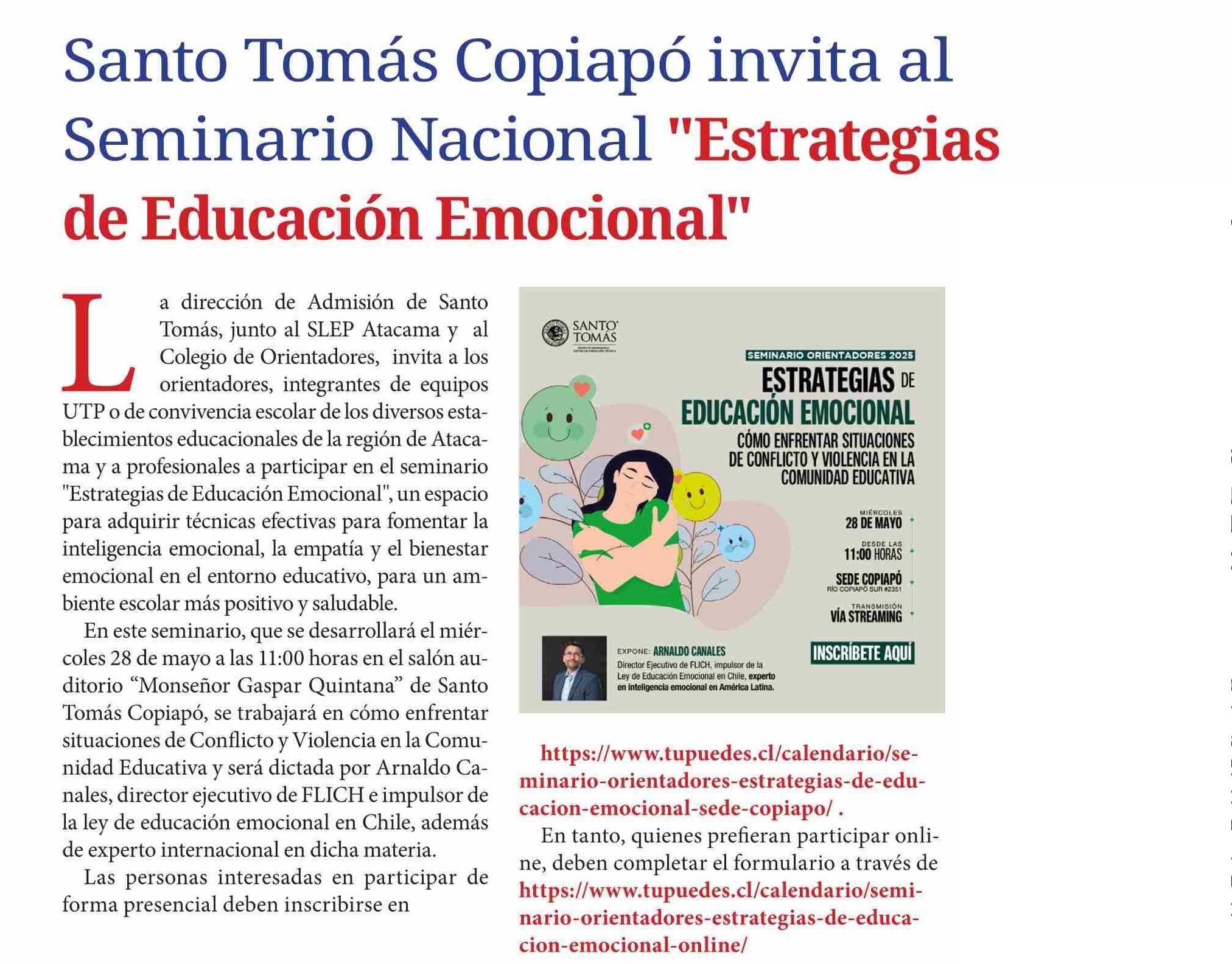 Santo Tomás Copiapó invita al Seminario Nacional Seminario Nacional de Educación Emocional" 23-05-2025 Diario Chañarcillo |