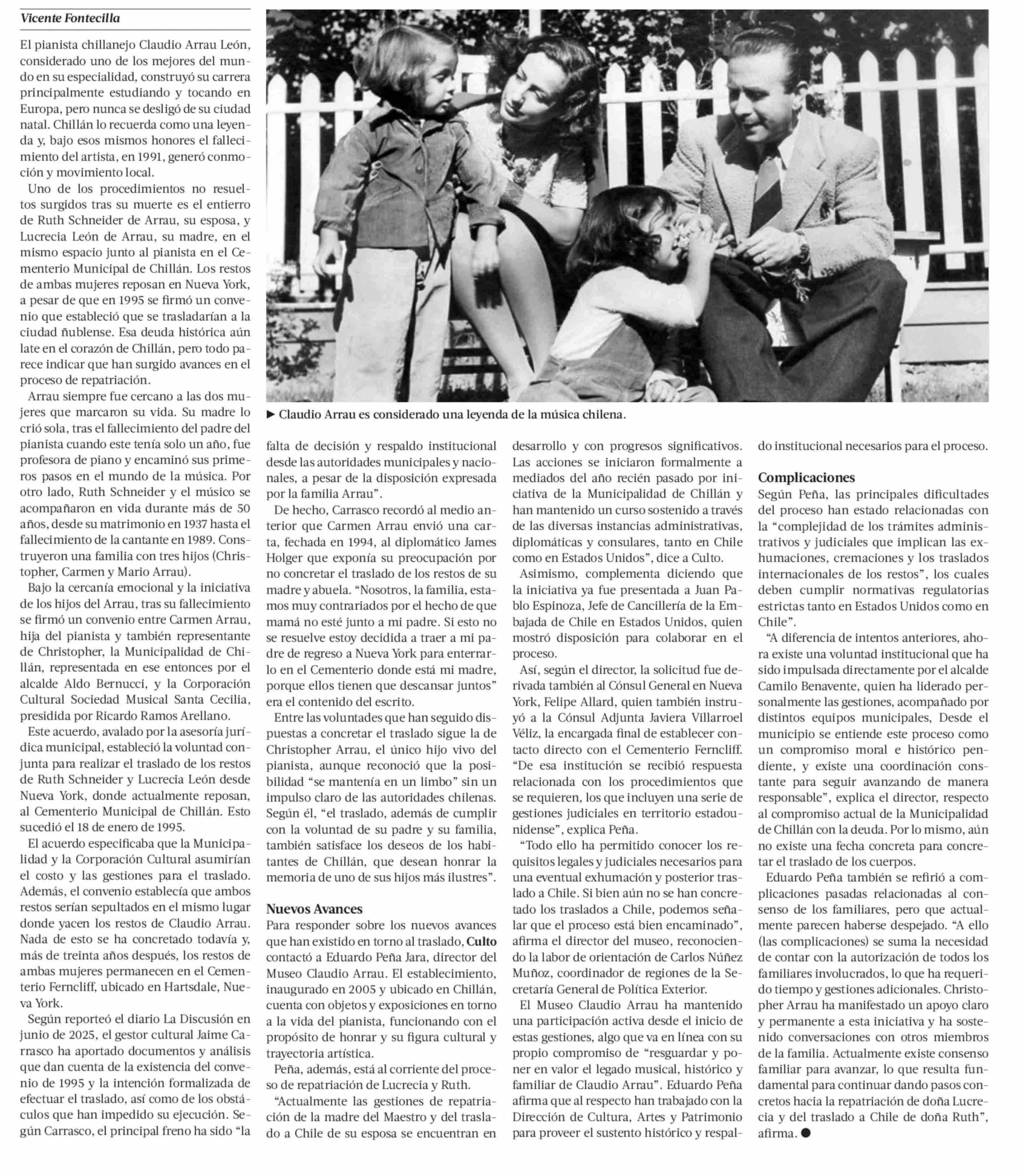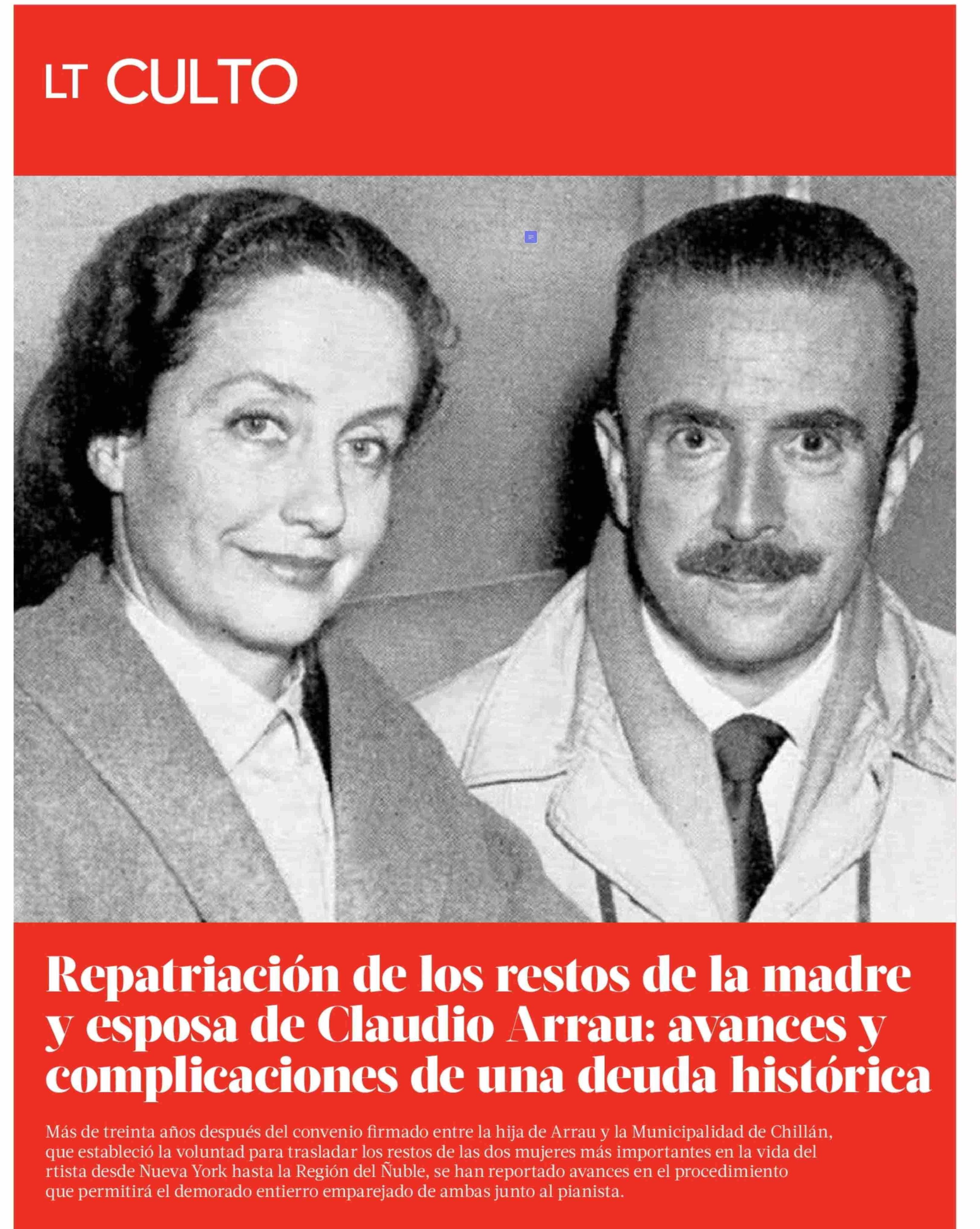 Repatriación de los restos de la madre y esposa de Claudio Arrau: avances y complicaciones de una deuda histórica 28-01-2026 La Tercera |