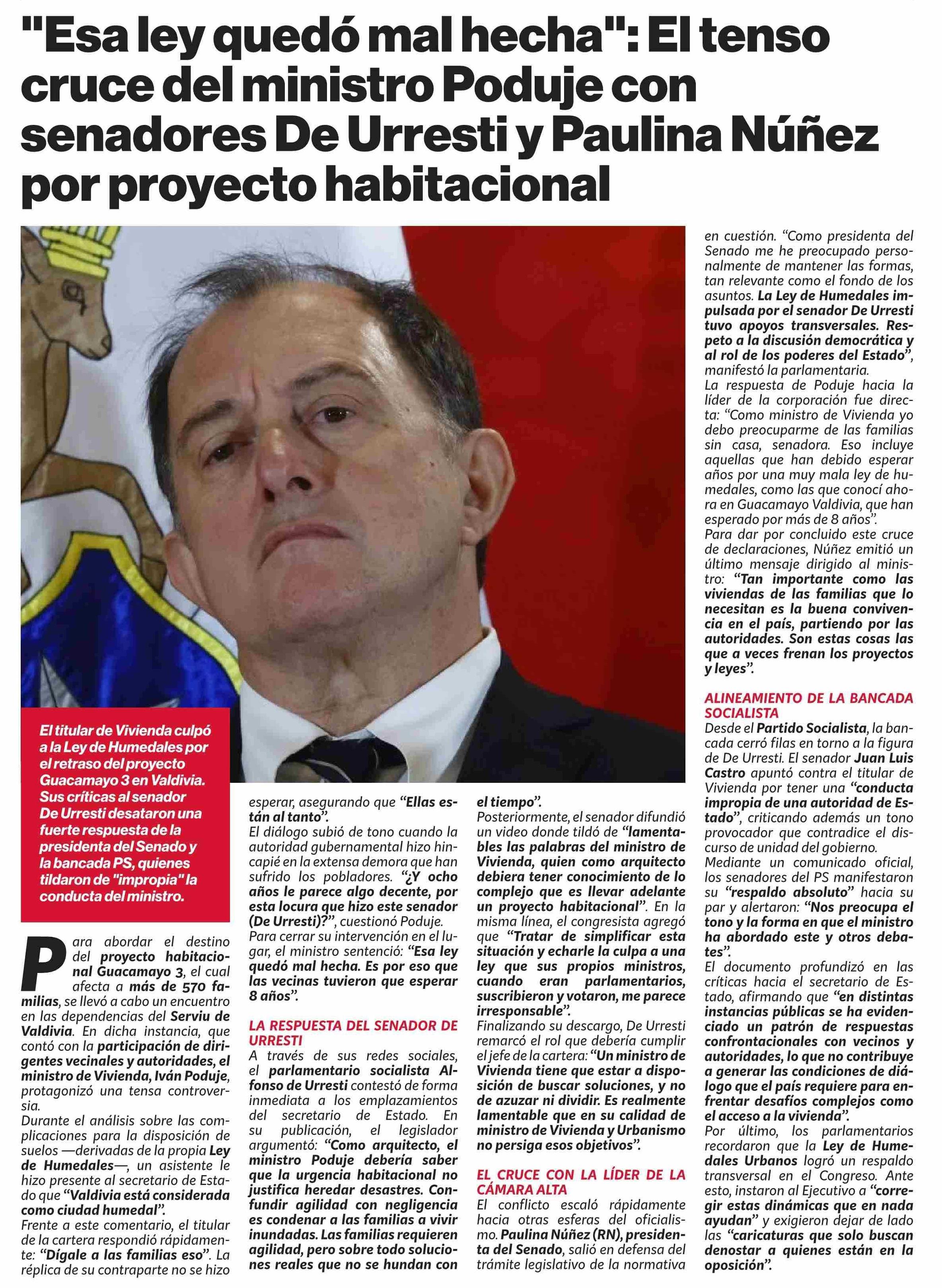 Título: "Esa ley quedó mal hecha": Eltenso cruce del ministro Poduje con senadores De Urresti y Paulina Núñez por proyecto habitacional