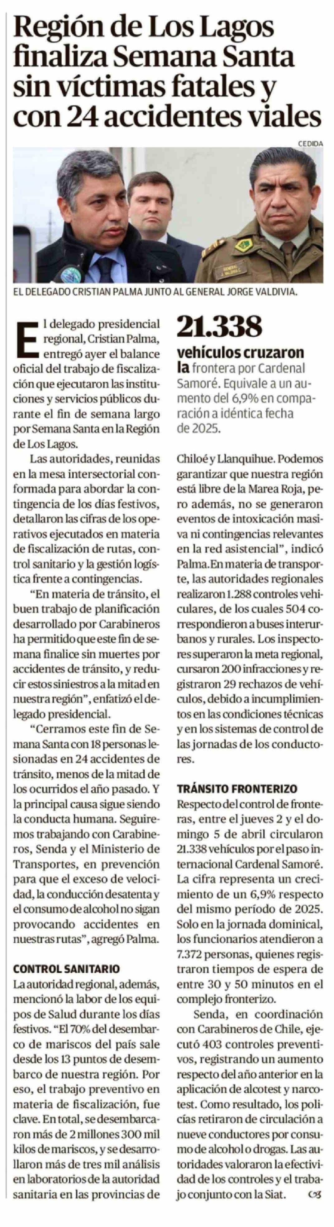 Región de Los Lagos finaliza Semana Santa sin víctimas fatales y con 24 accidentes viales 07-04-2026 El Llanquihue |