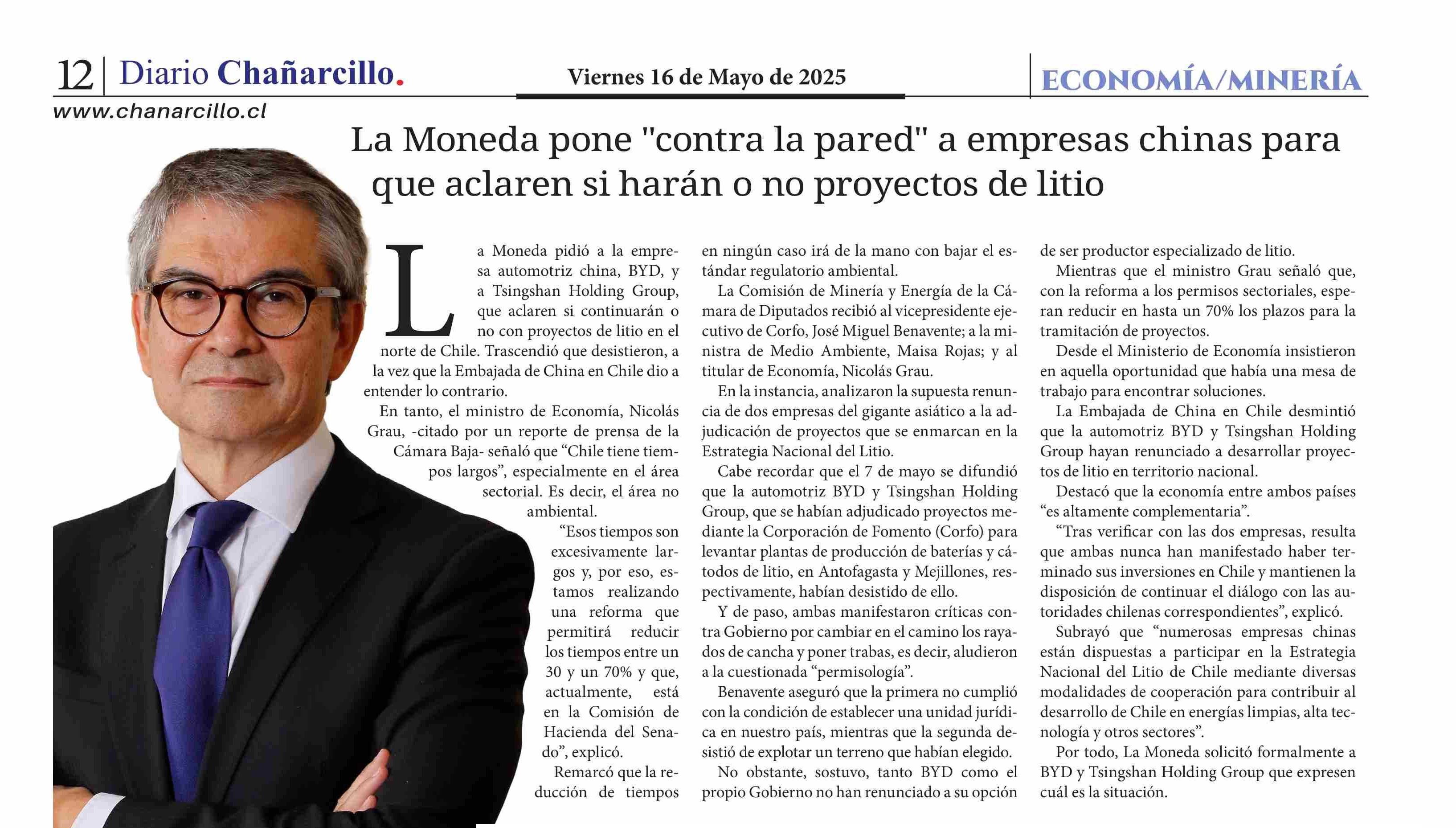 La Moneda pone "contra la pared" a empresas chinas para , que aclaren si harán o no proyectos de litio 16-05-2025 Diario Chañarcillo |