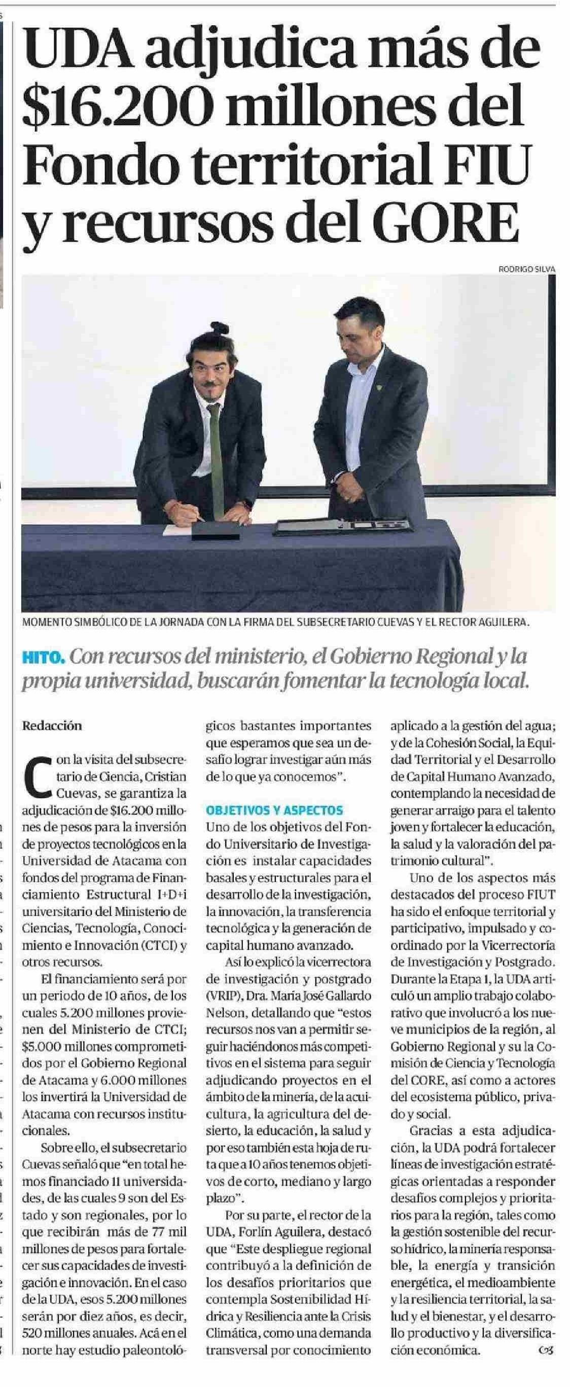 UDA adjudica más de $16.200 millones del Fondo territorial FIU y recursos del GORE 10-01-2026 El Diario de Atacama |