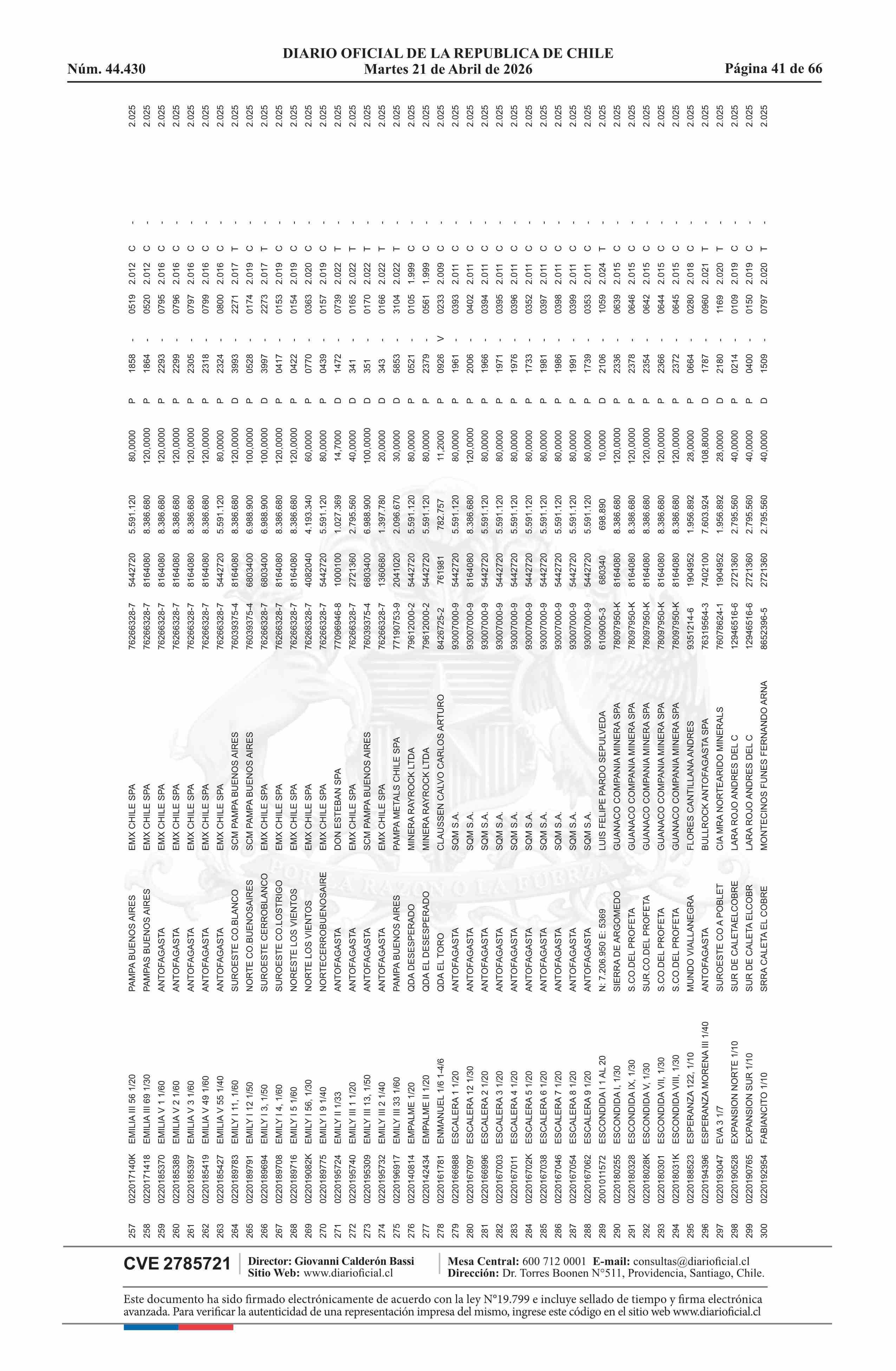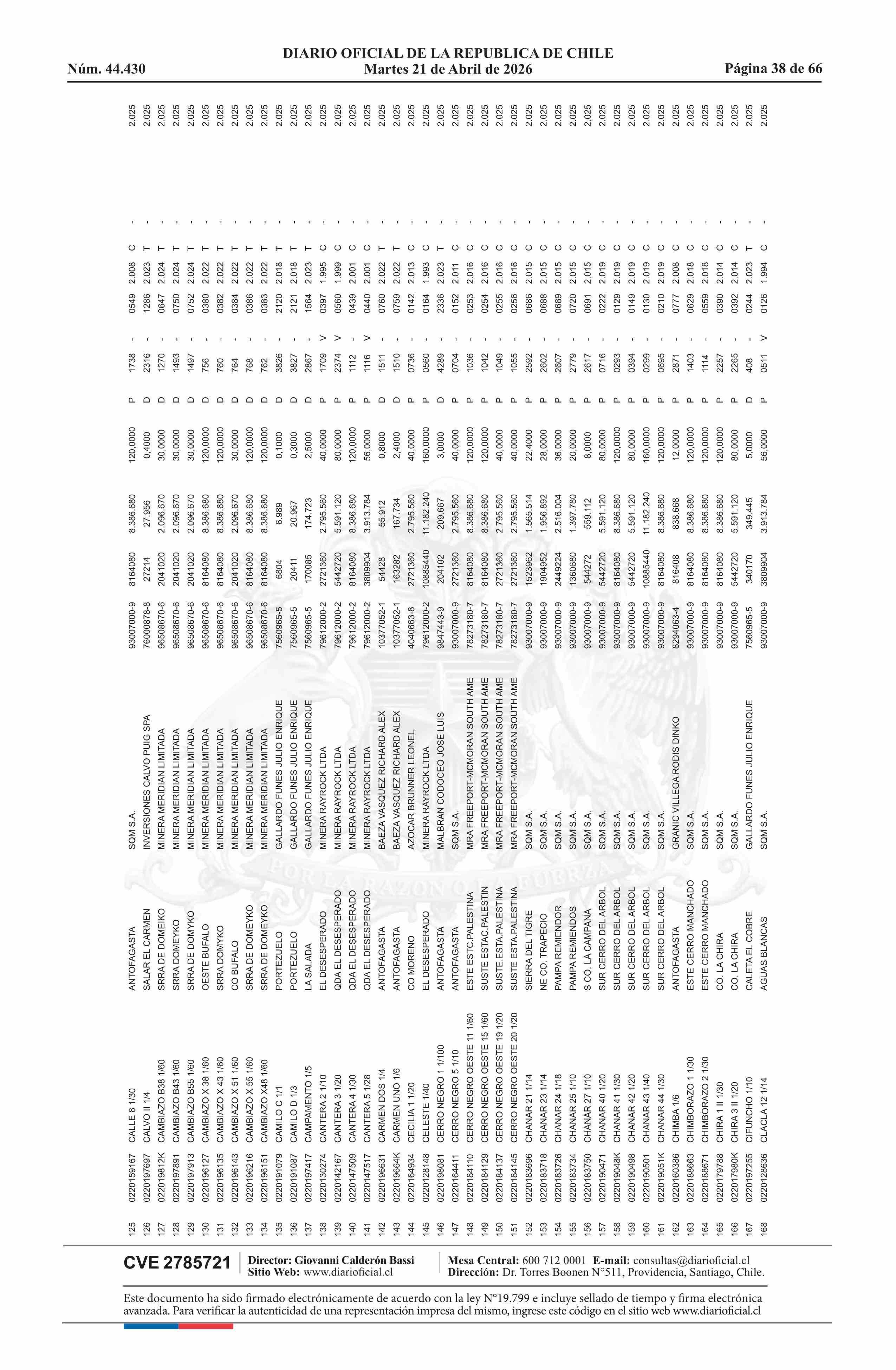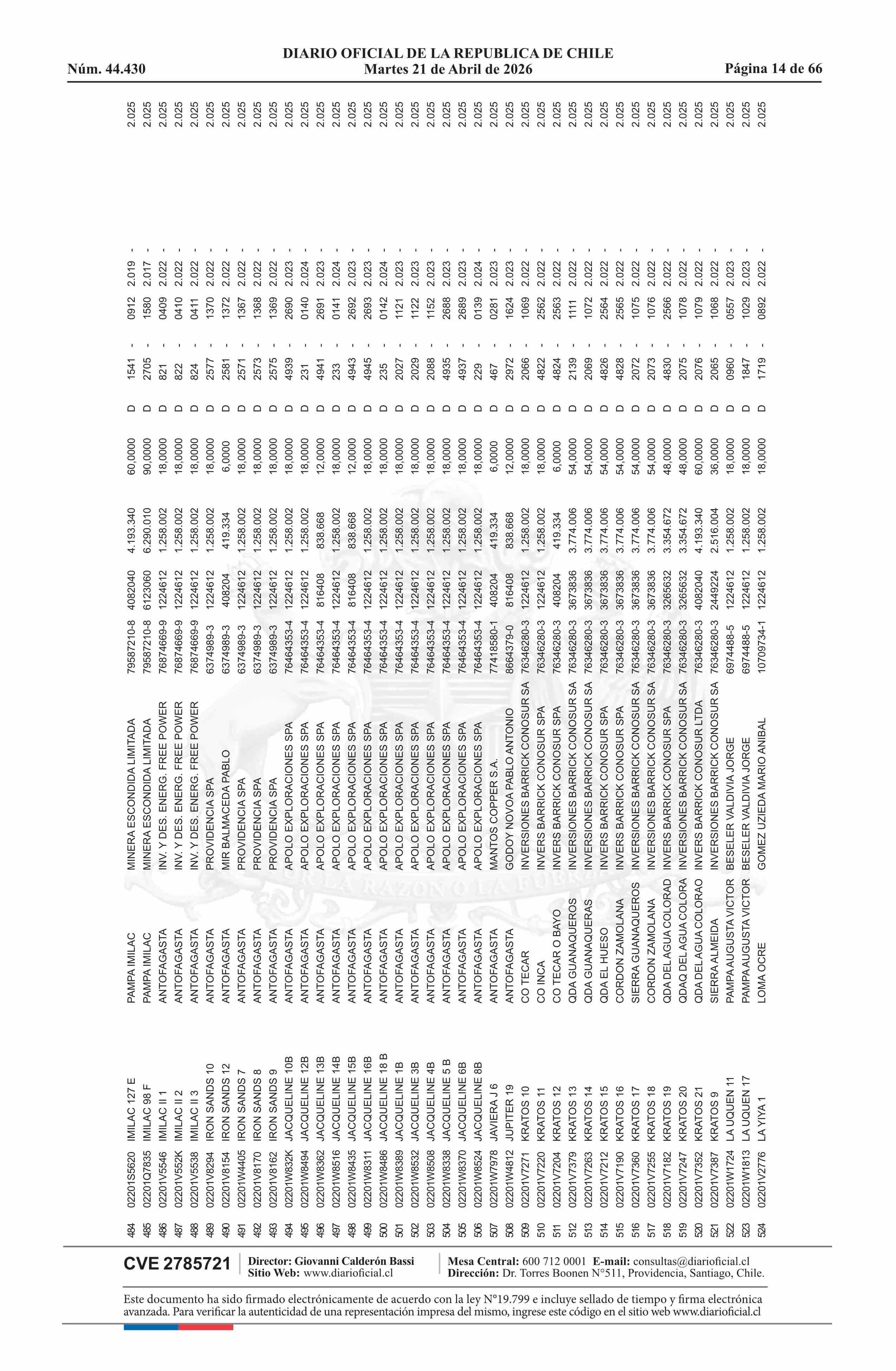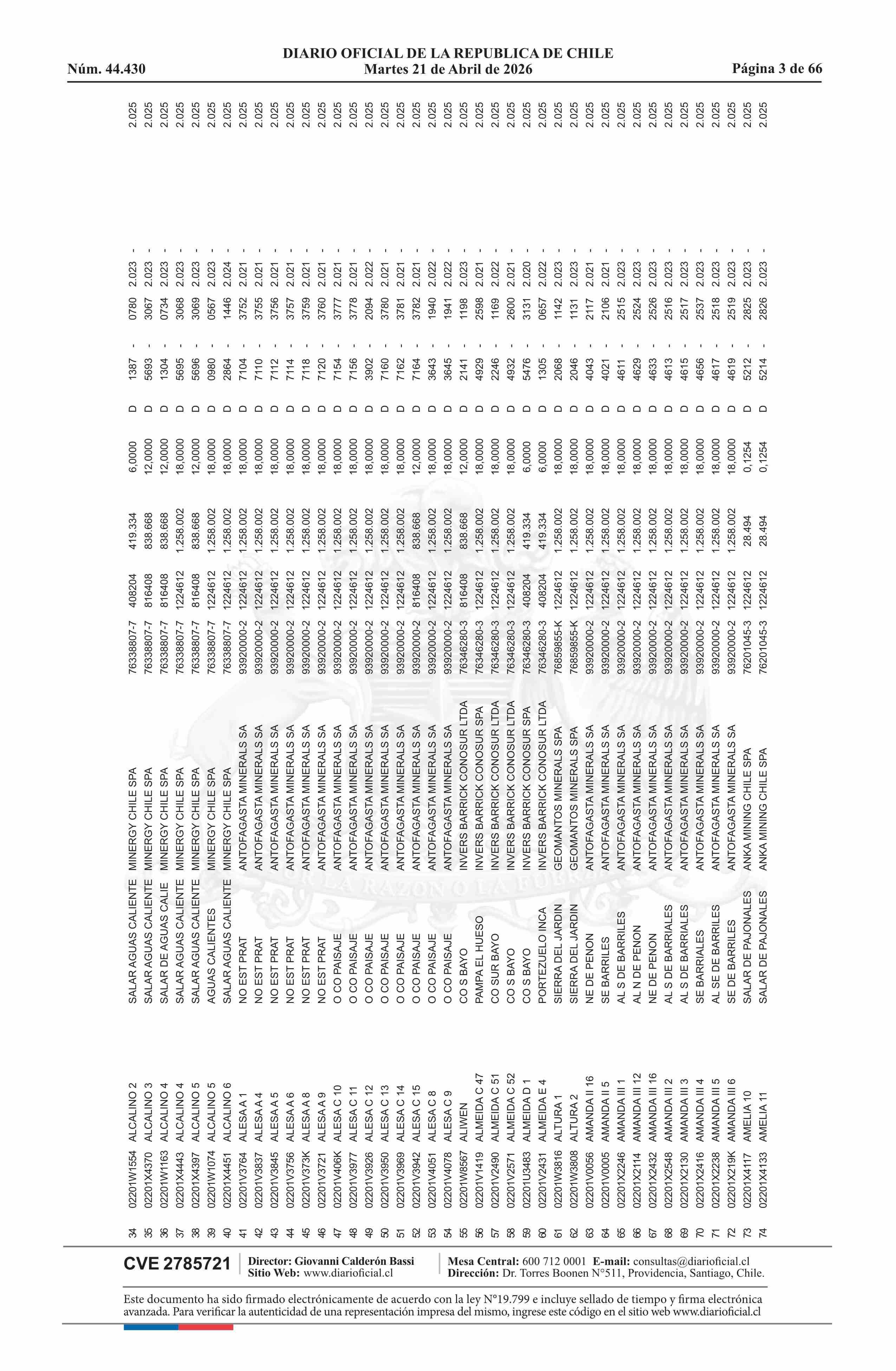 Fuente: DIARIO OFICIAL CHILE - BOLETÍN OFICIAL DE MINERÍA (DIARIO OFICIAL CHILE – BOM – NÓMINA REMATE) Página(s): 1-66