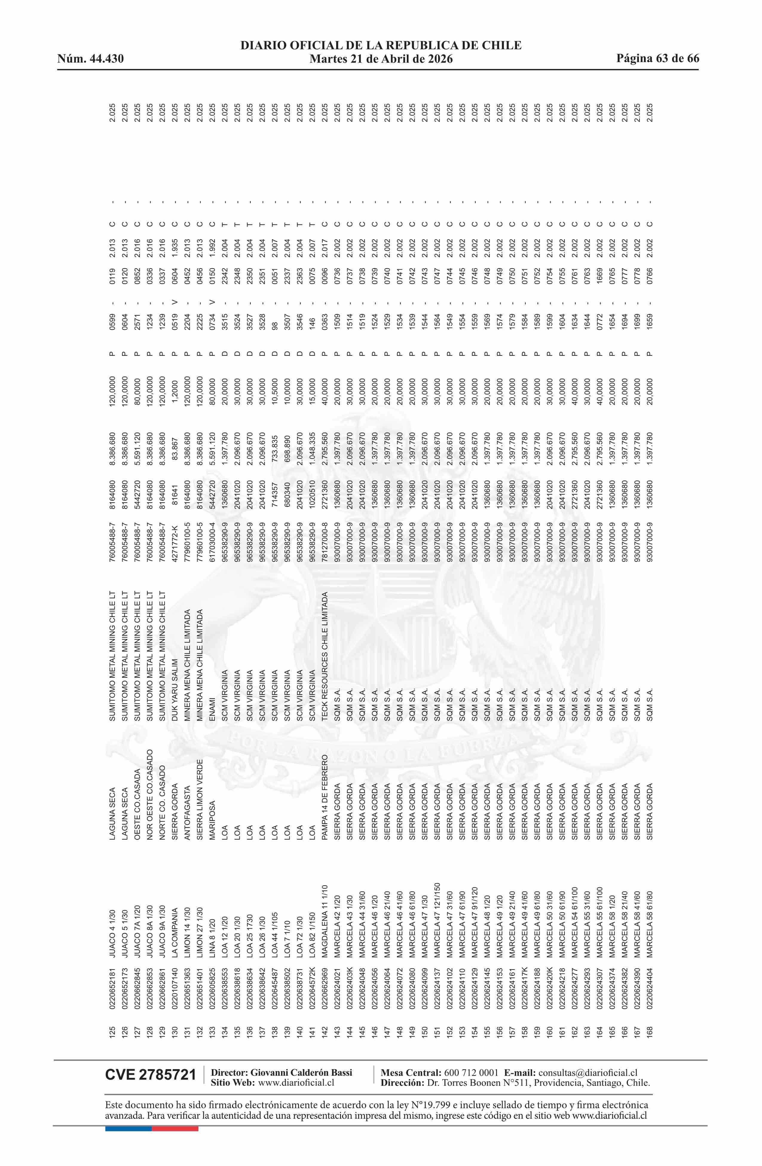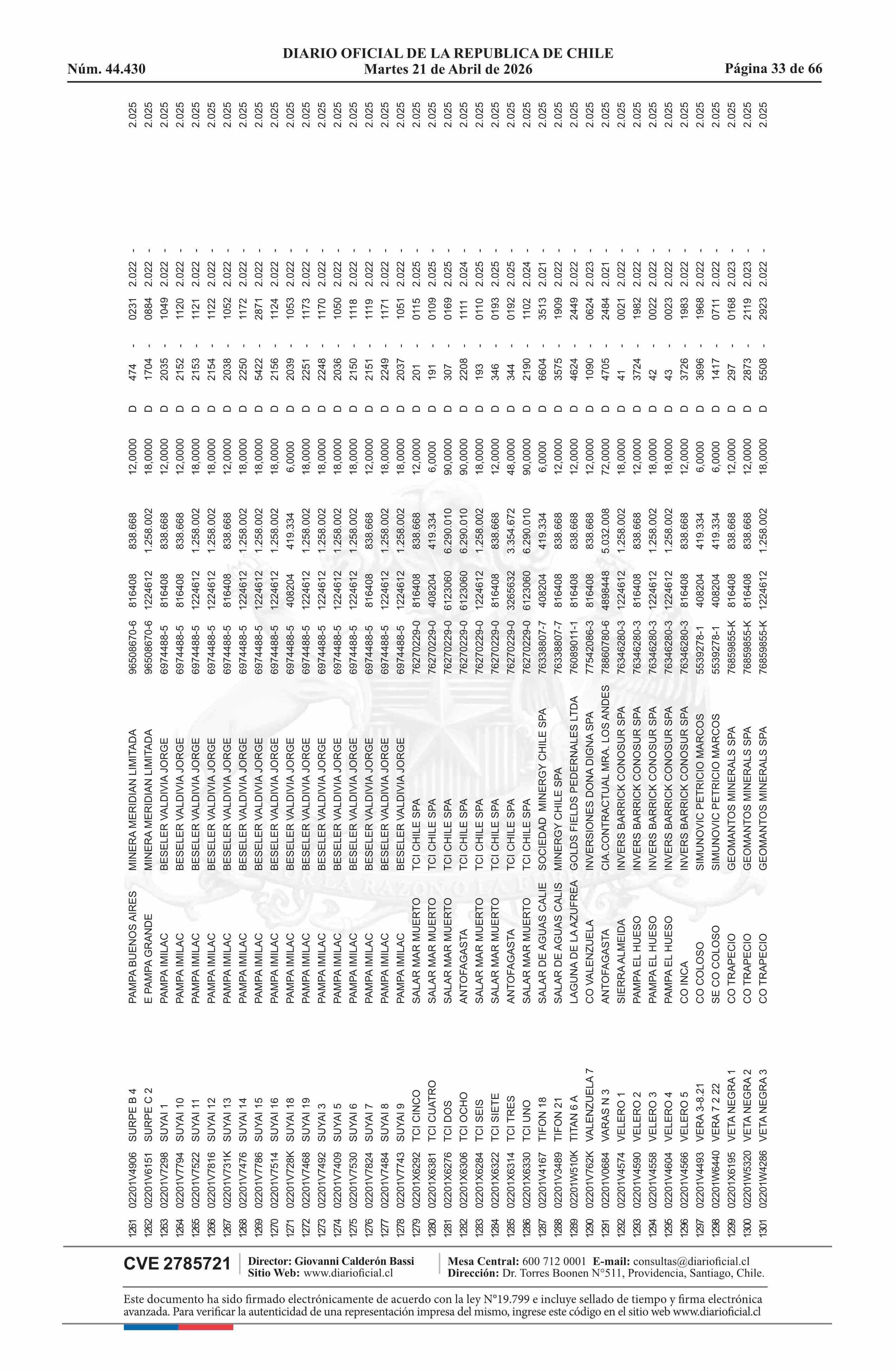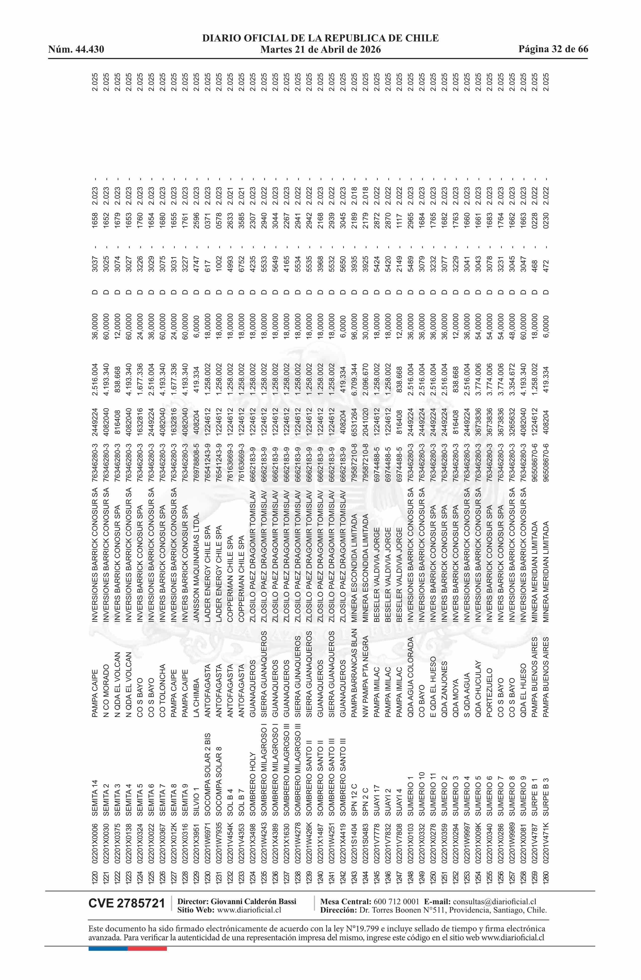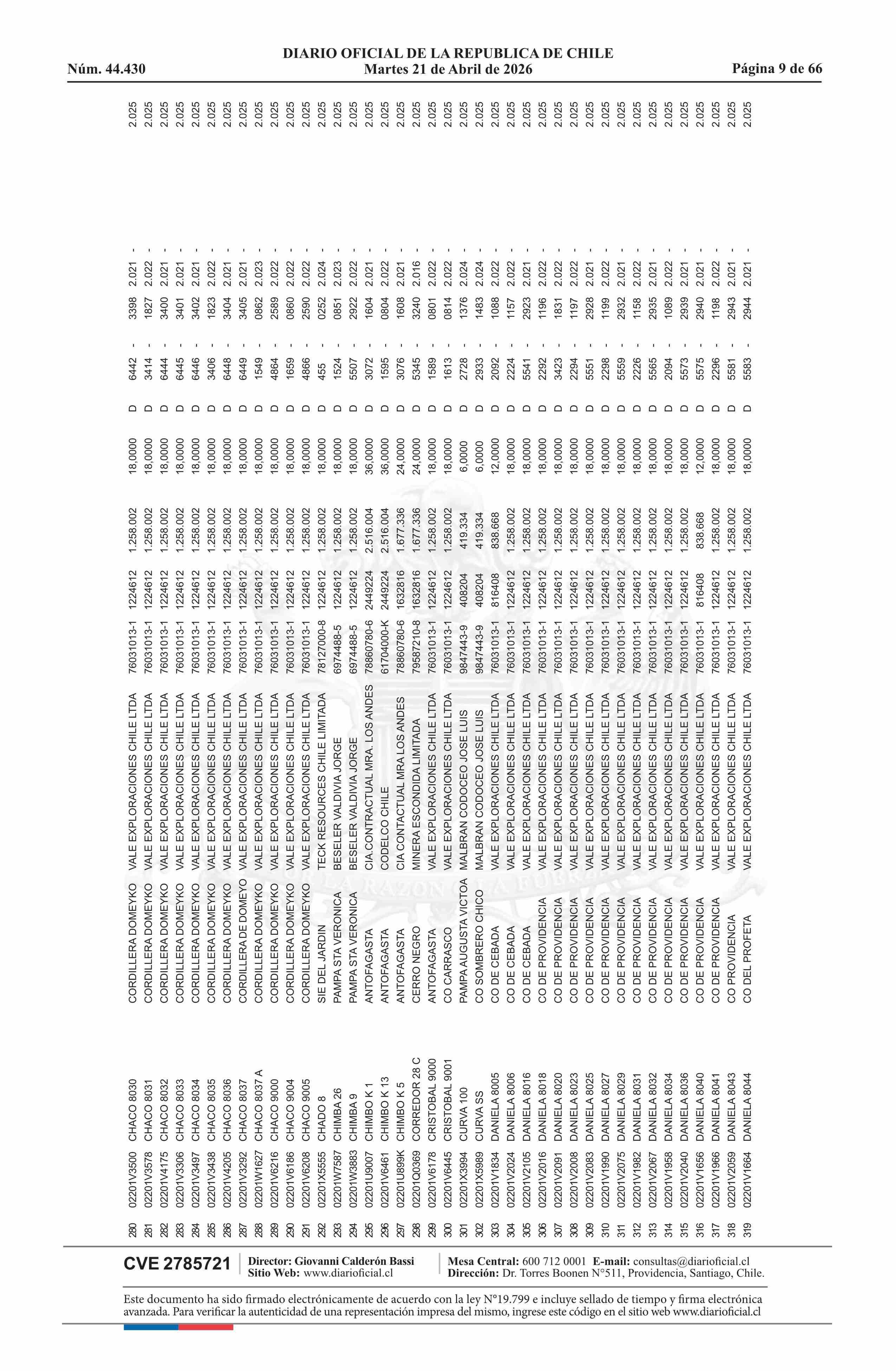 Fuente: DIARIO OFICIAL CHILE - BOLETÍN OFICIAL DE MINERÍA (DIARIO OFICIAL CHILE – BOM – NÓMINA REMATE) Página(s): 1-66