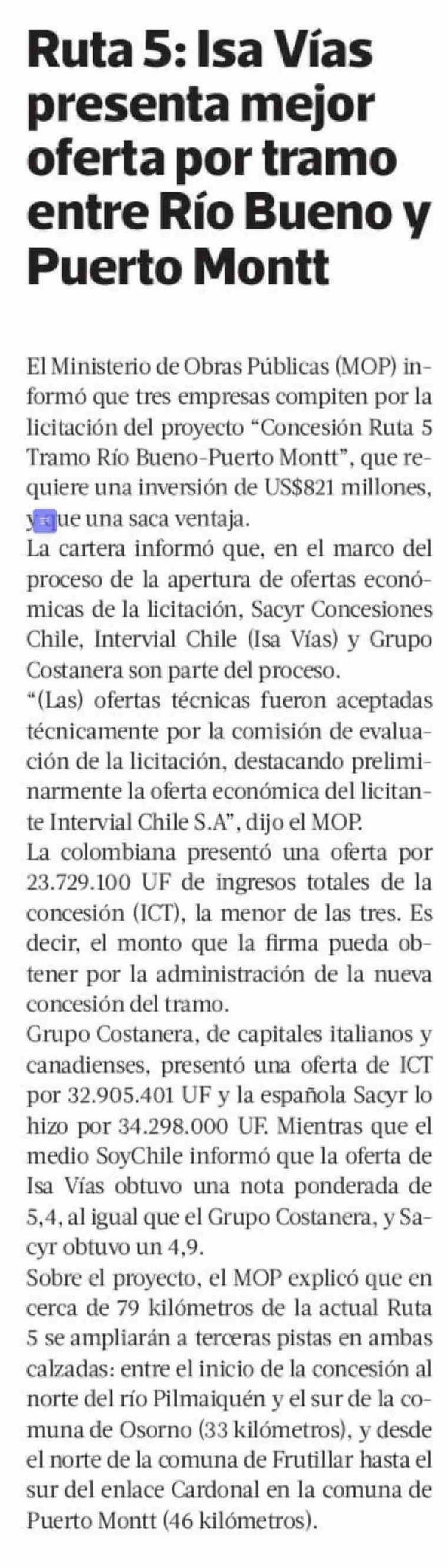 | Título: | Ruta 5: Isa Vías presenta mejor oferta por tramo entre Río Bueno y Puerto Montt |