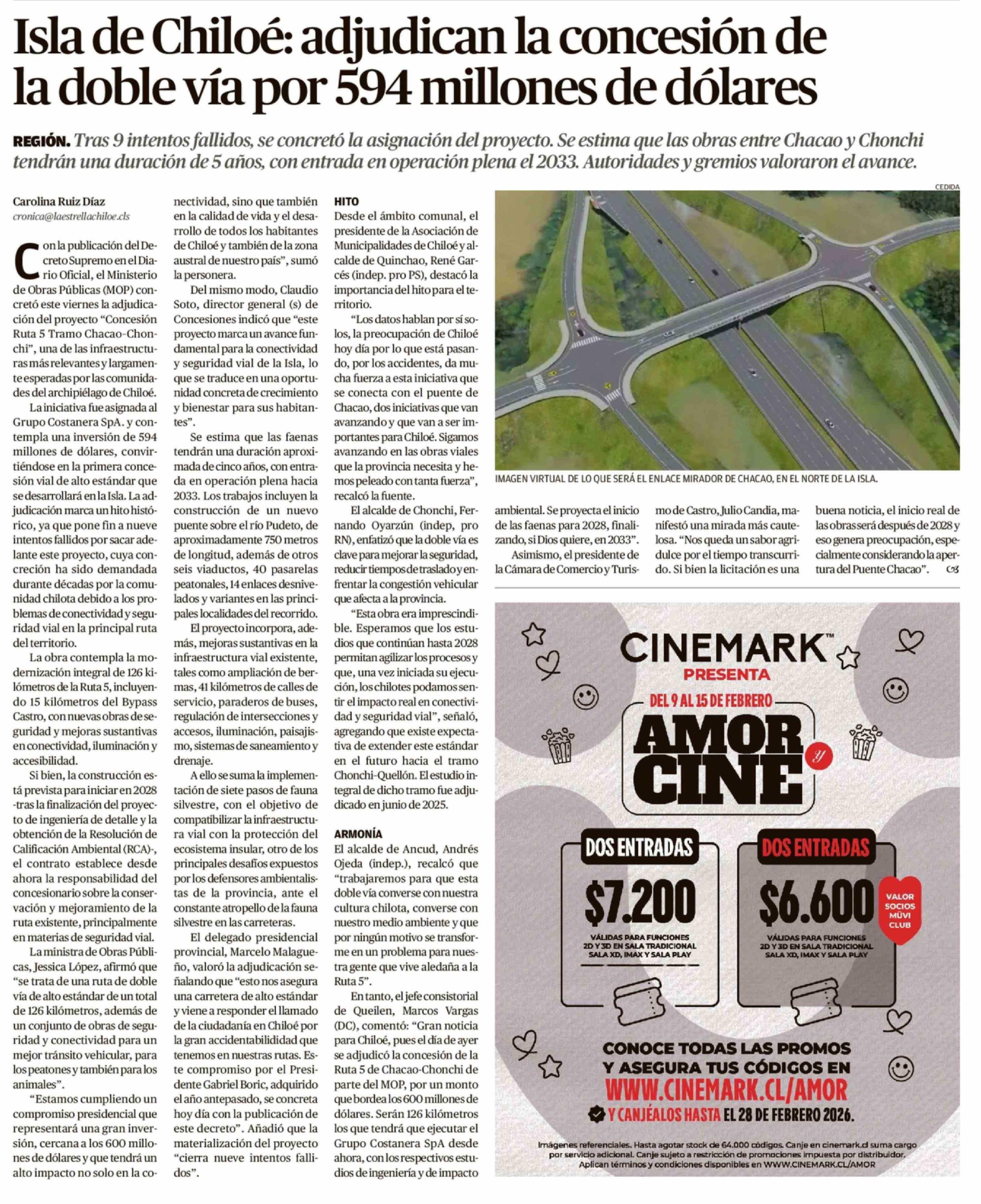 Isla de Chiloé: adjudican la concesión de la doble vía por 594 millones de dólares 15-02-2026 El Austral de Osorno |
