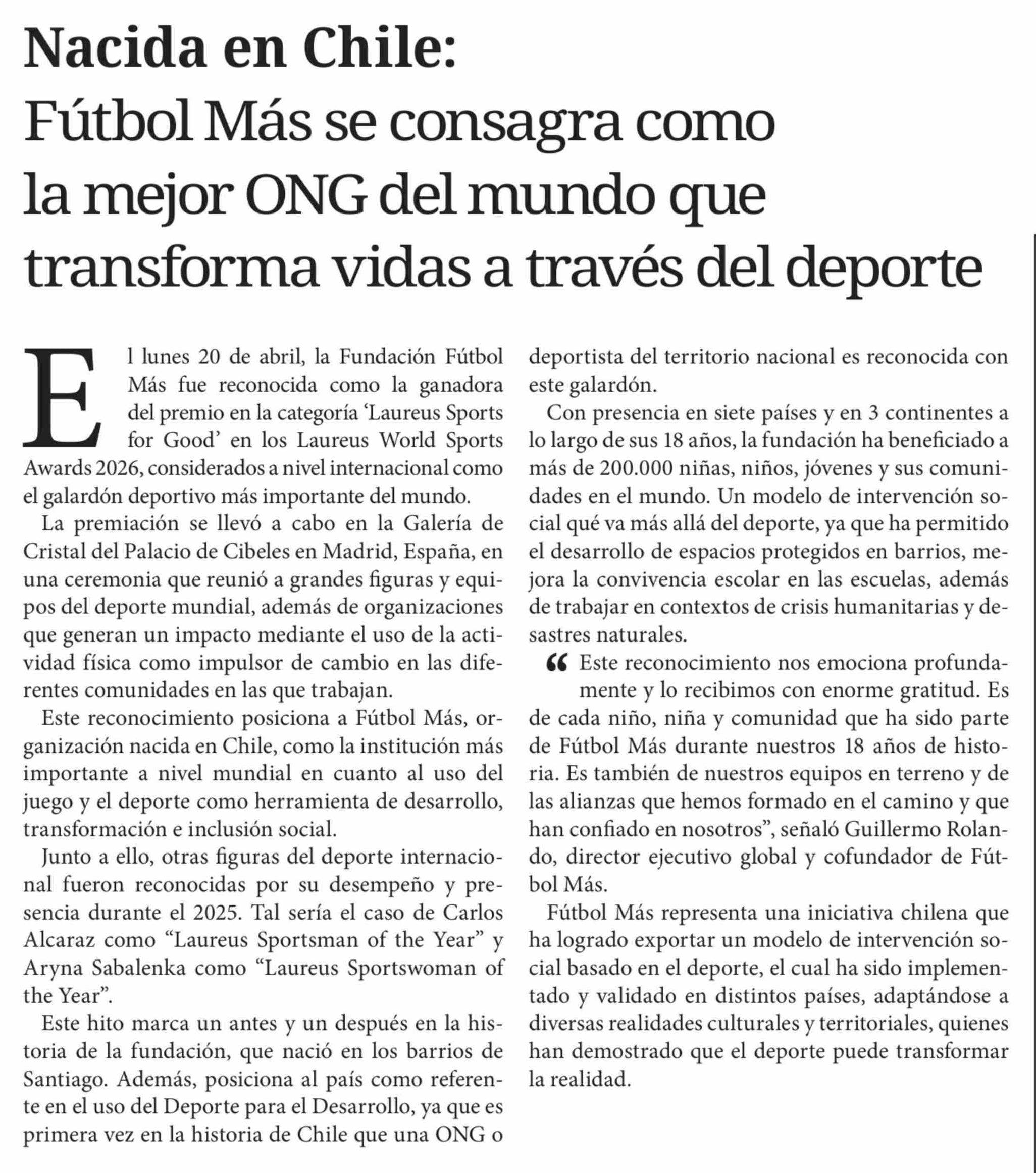 Nacida en Chile: Fútbol Más se consagra como la mejor ONG del mundo que transforma vidas a través del deporte 22-04-2026 Diario Chañarcillo |