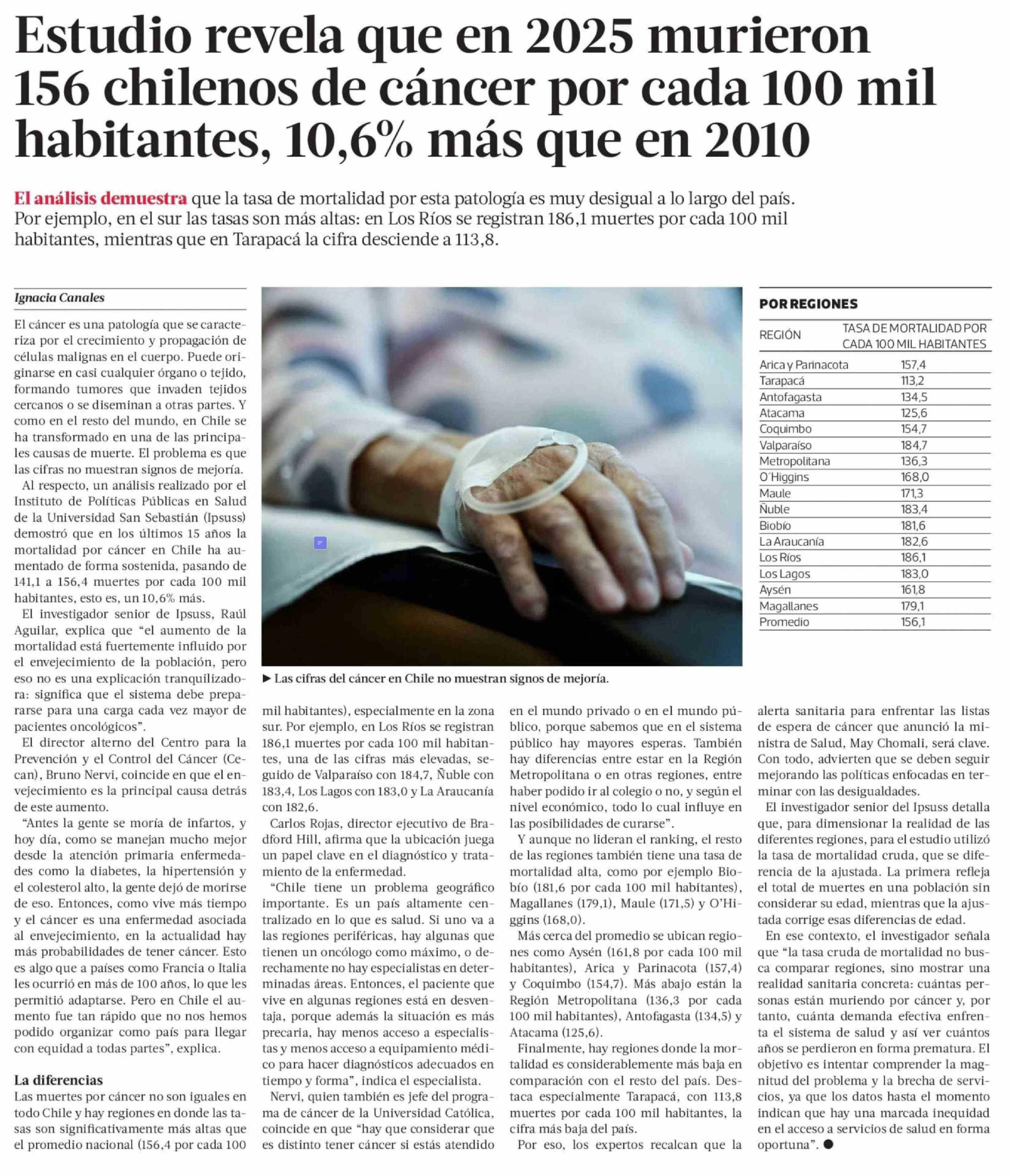 | Título: | Estudio revela que en 2025 murieron 156 chilenos de cáncer por cada 100 mil habitantes, 10,6% más que en 2010 |