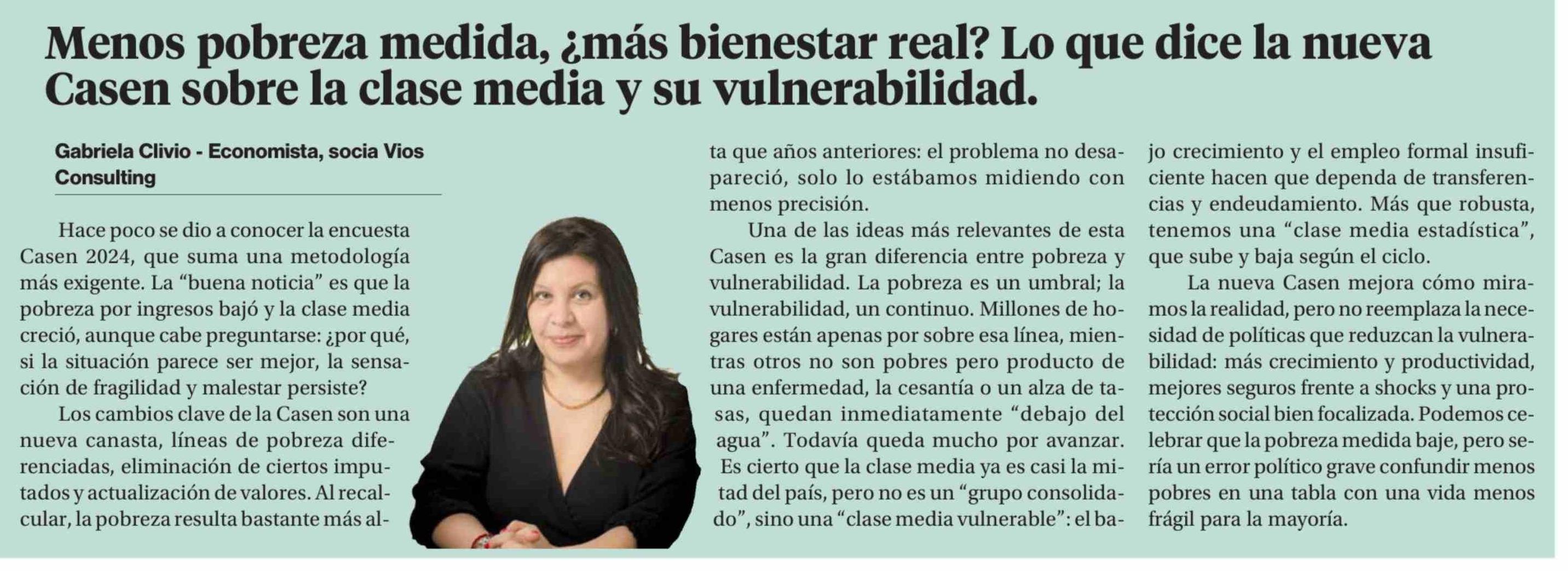 | Título: | Columnas de Opinión: Menos pobreza medida, ¿más bienestar real? Lo que dice la nueva Casen sobre la clase media y su vulnerabilidad. |