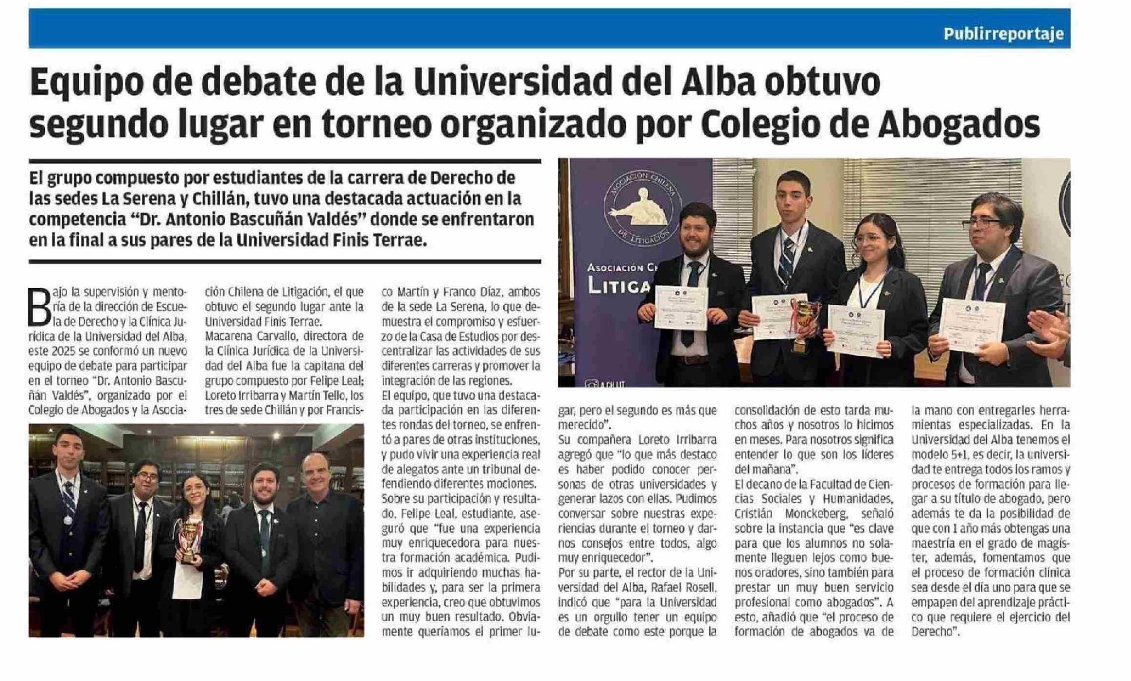 Equipo de debate de la Universidad del Alba obtuvo segundo lugar en torneo organizado por Colegio de Abogados 21-05-2025 El Mercurio de Antofagasta |