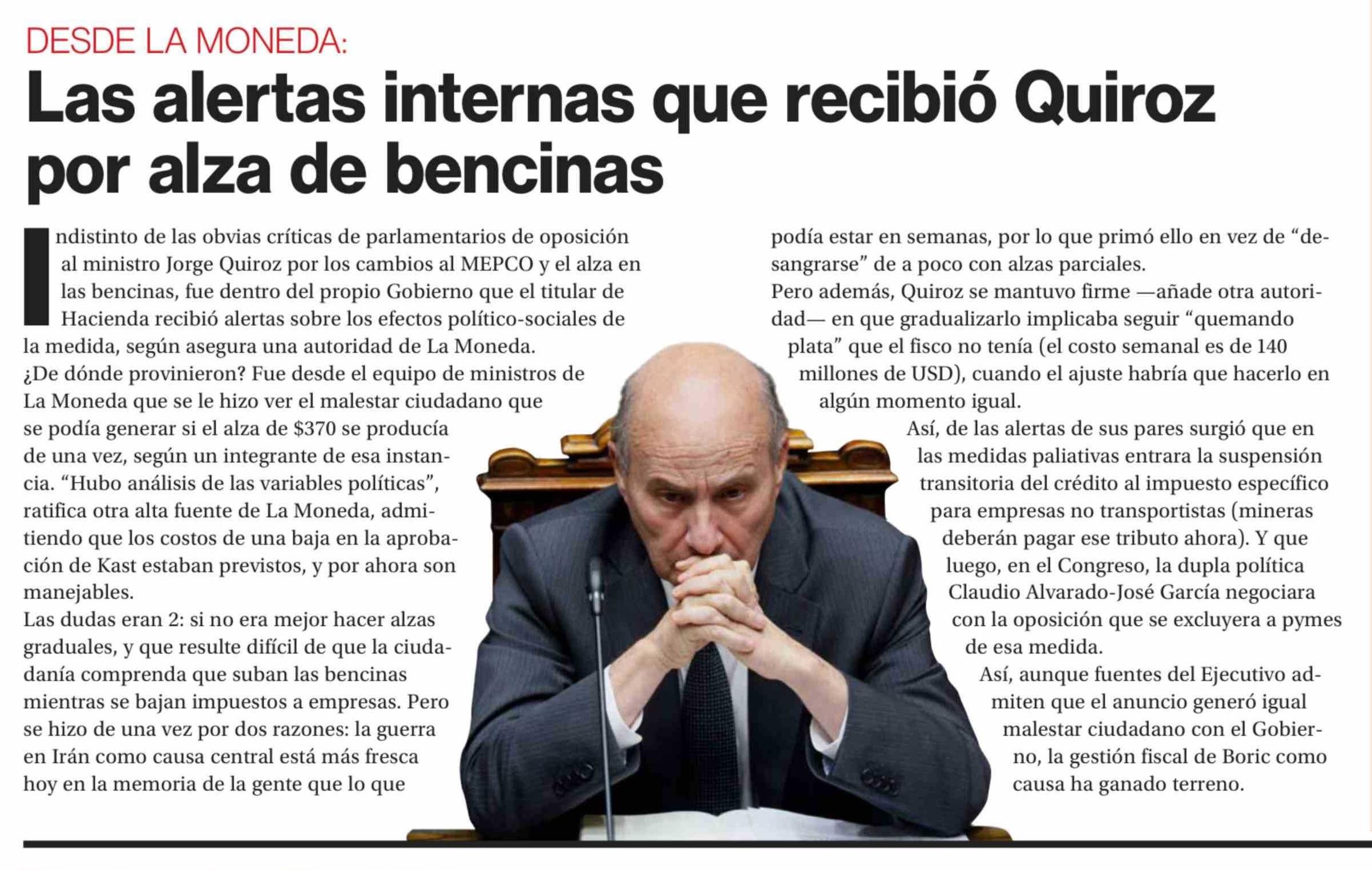 | Título: | Las alertas internas que recibió Quiroz por alza de bencinas |
