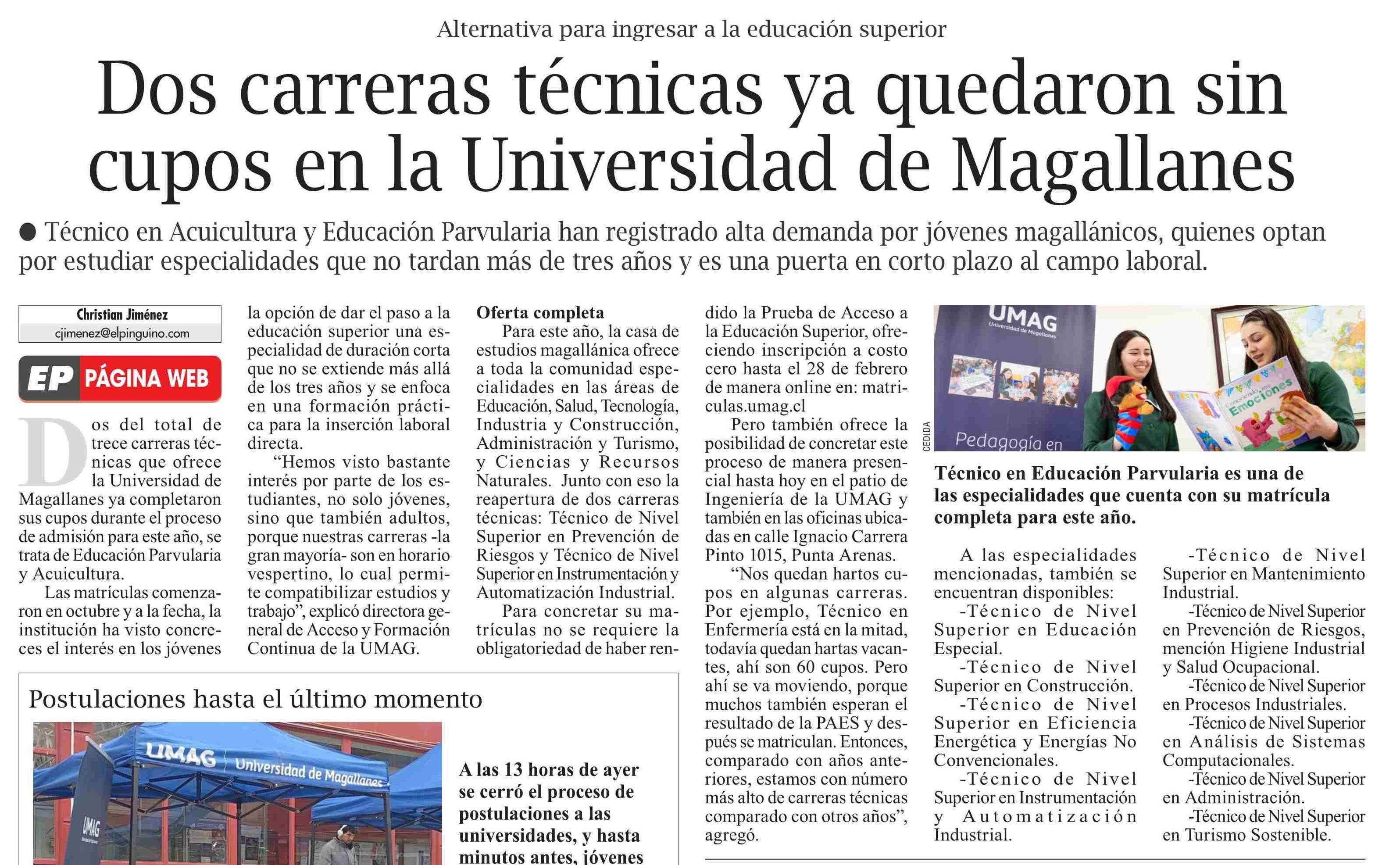 Dos carreras técnicas ya quedaron sin cupos en la Universidad de Magallanes 09-01-2026 El Pingüino |