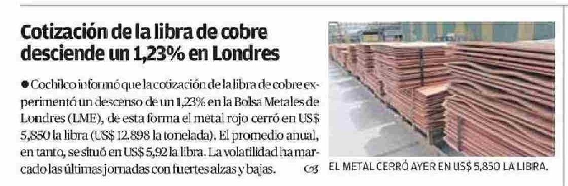 Título: Cotización de la libra de cobre desciende un 1,23% en Londres