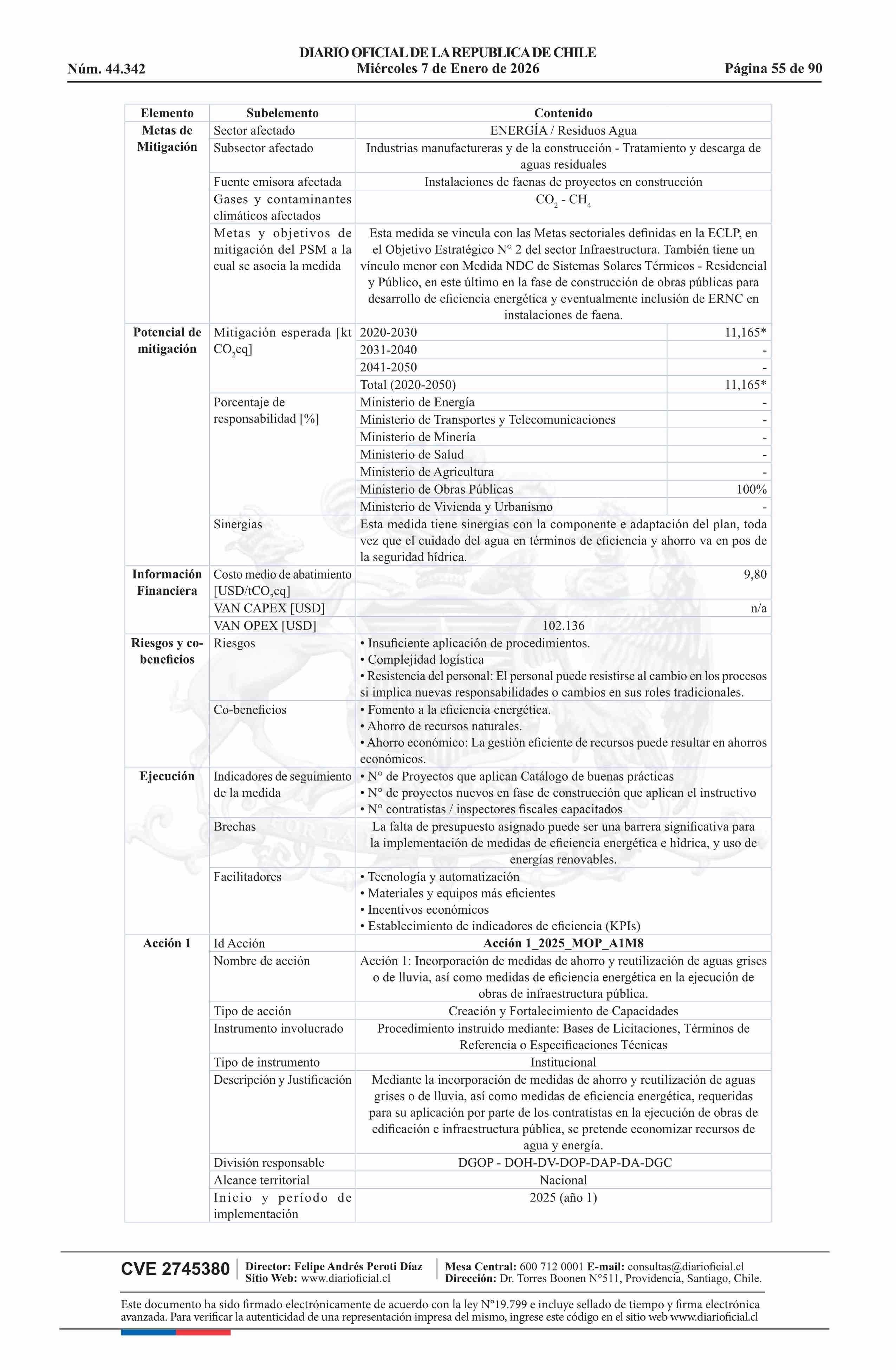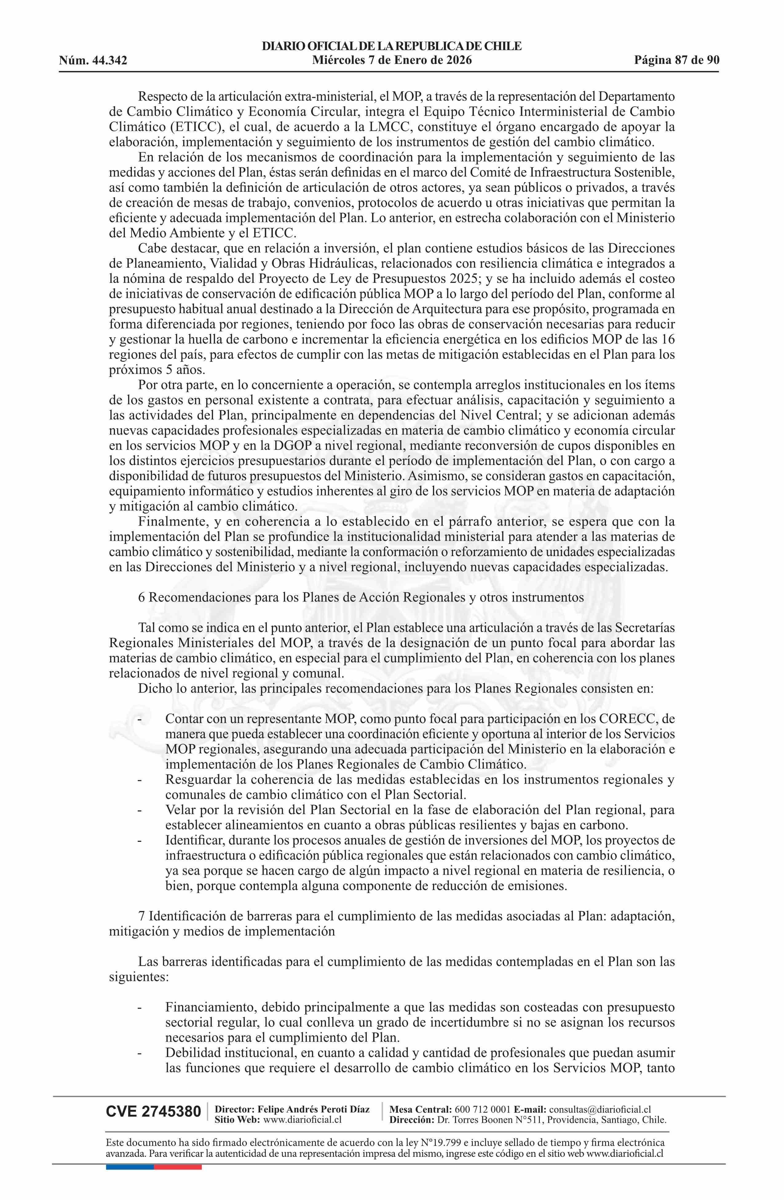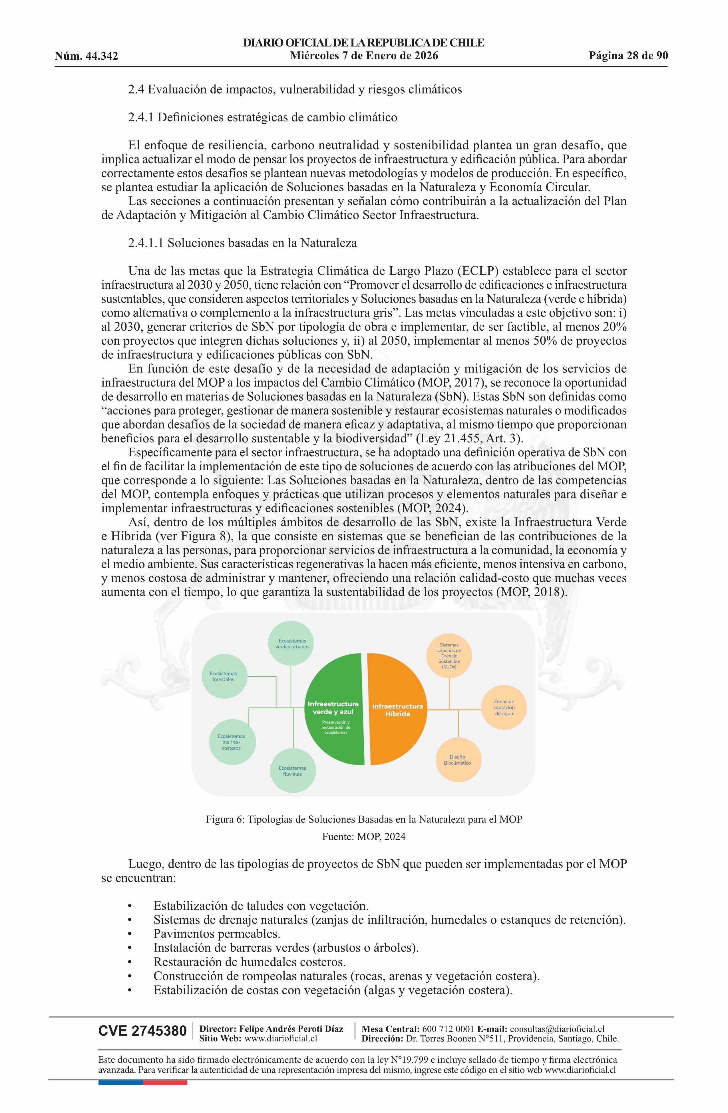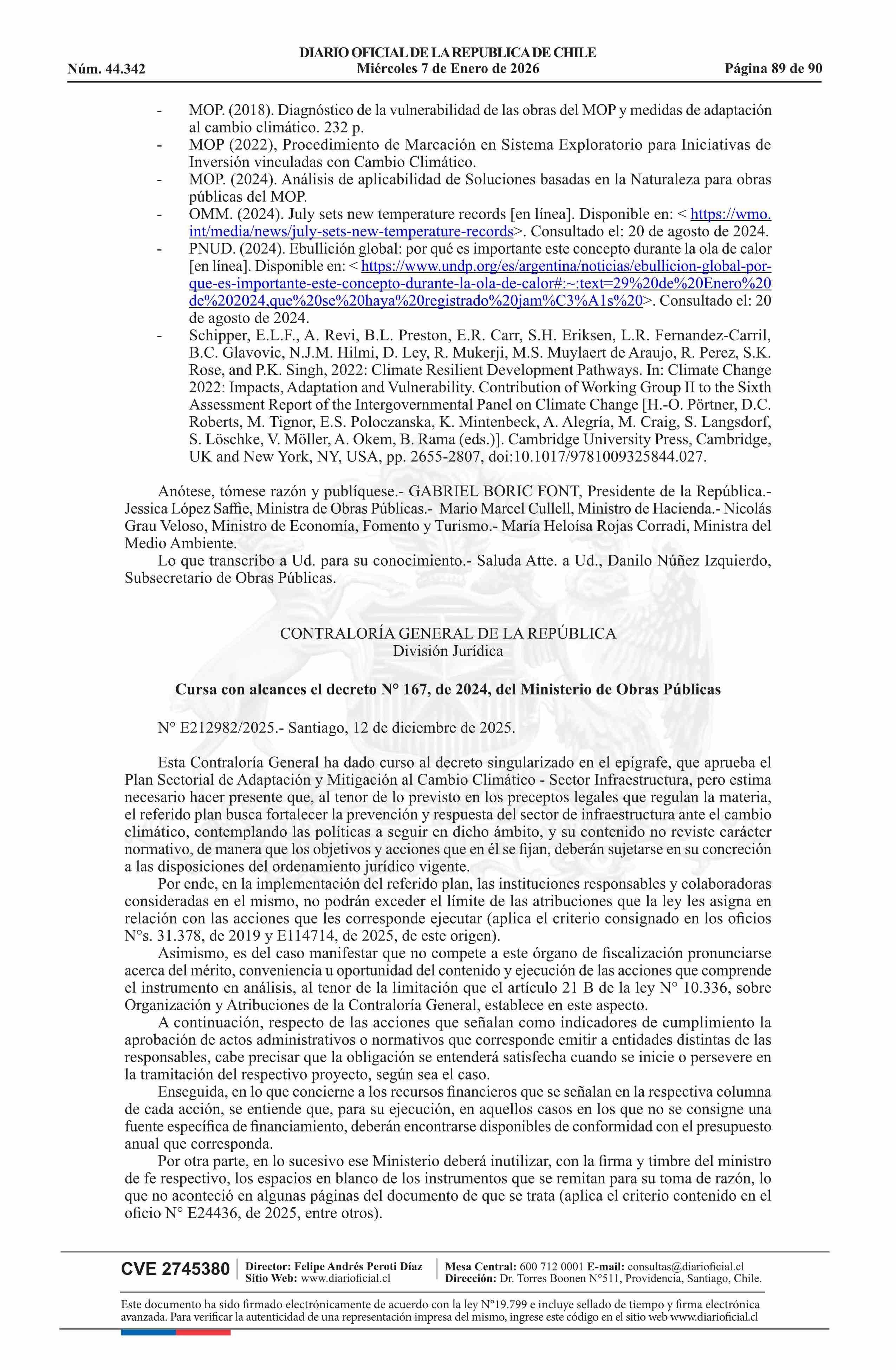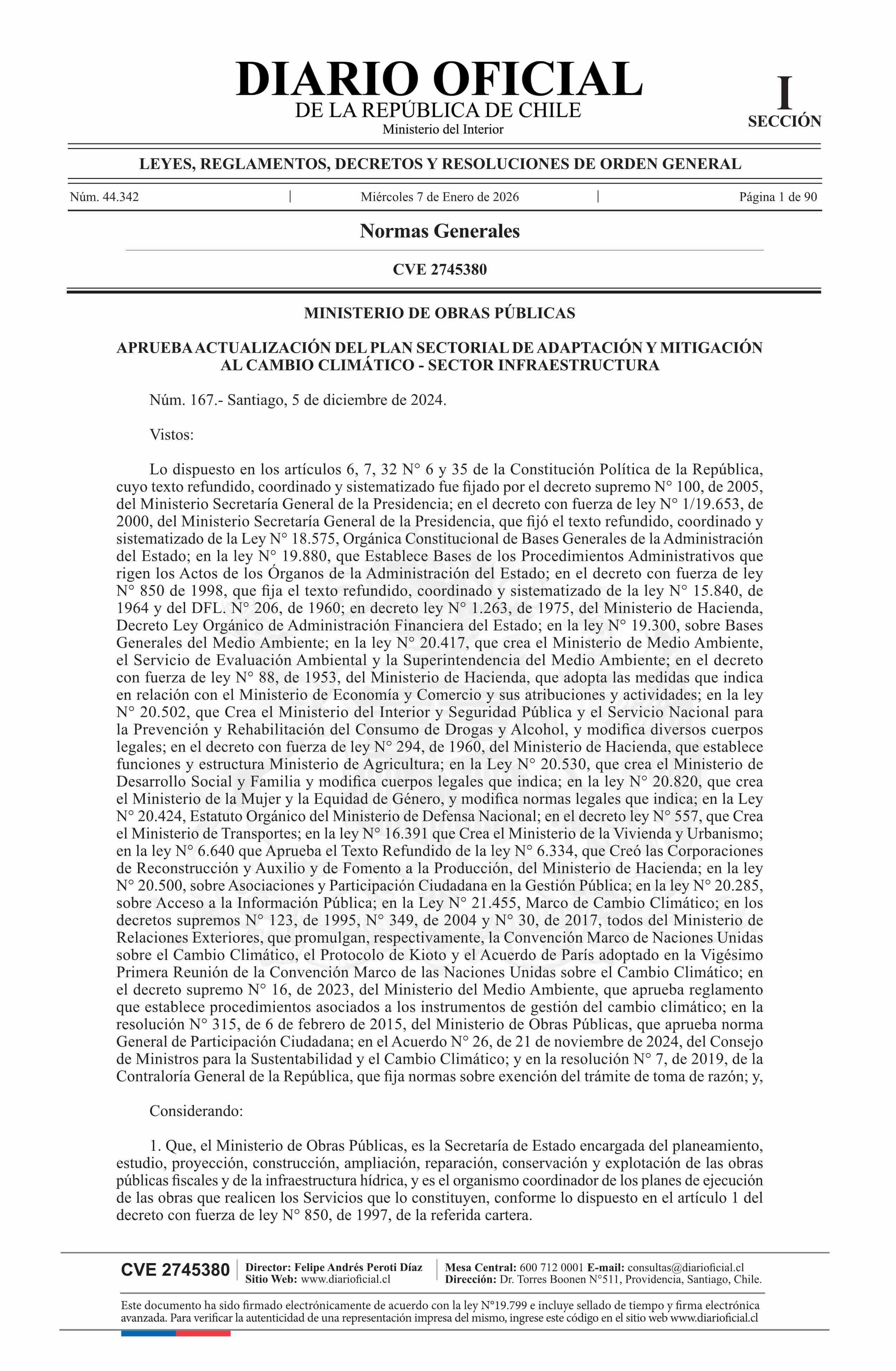 Decreto número 167, de 2024.- Aprueba actualización del Plan Sectorial de Adaptación y Mitigación al Cambio Climático - Sector Infraestructura 07-01-2026 Diario Oficial Edición Electrónica |