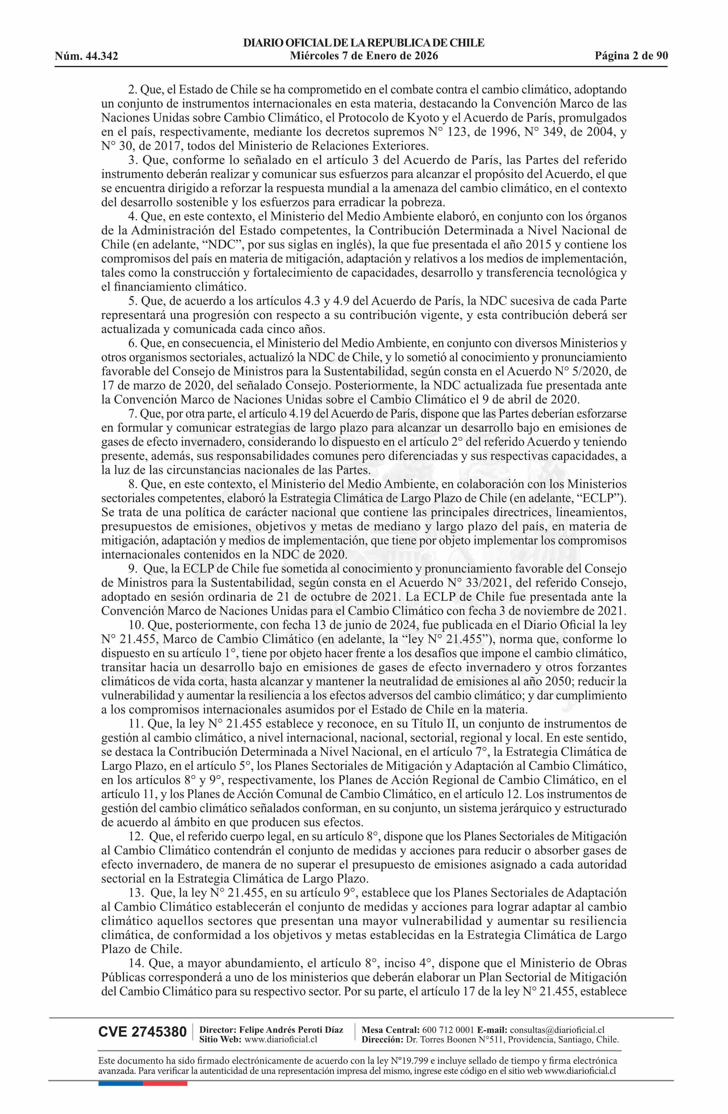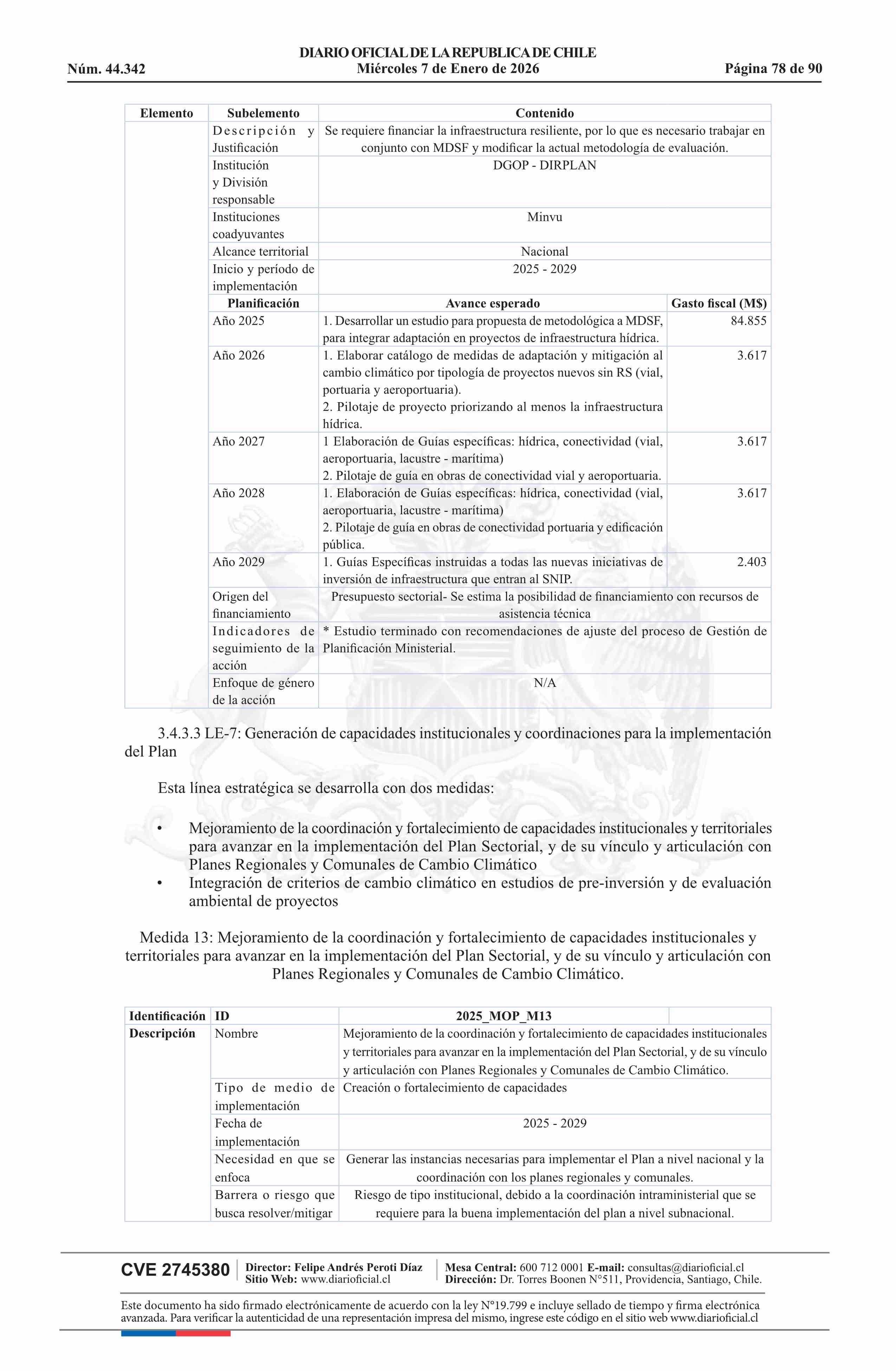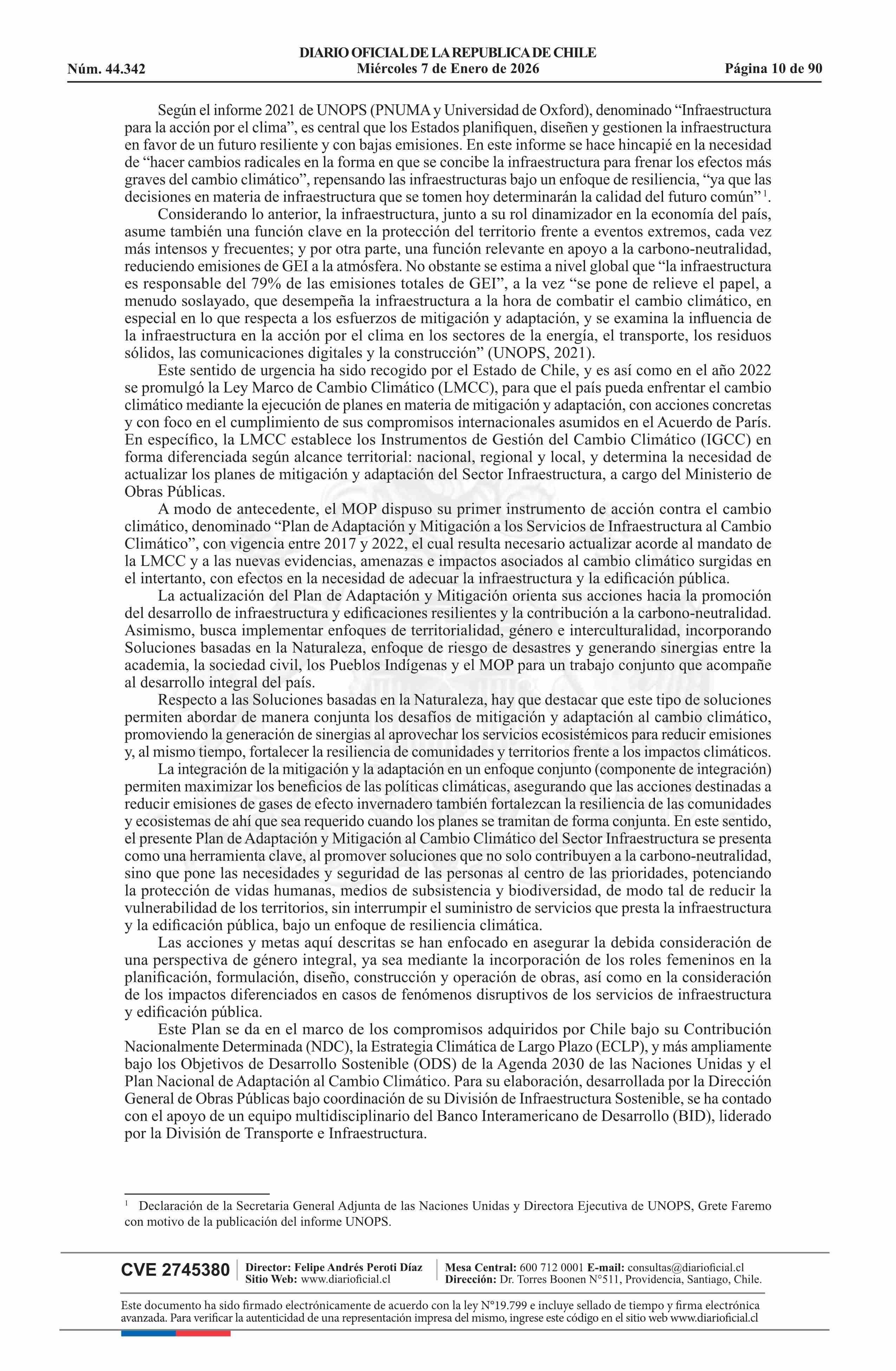 | Título: | Decreto número 167, de 2024.- Aprueba actualización del Plan Sectorial de Adaptación y Mitigación al Cambio Climático - Sector Infraestructura |