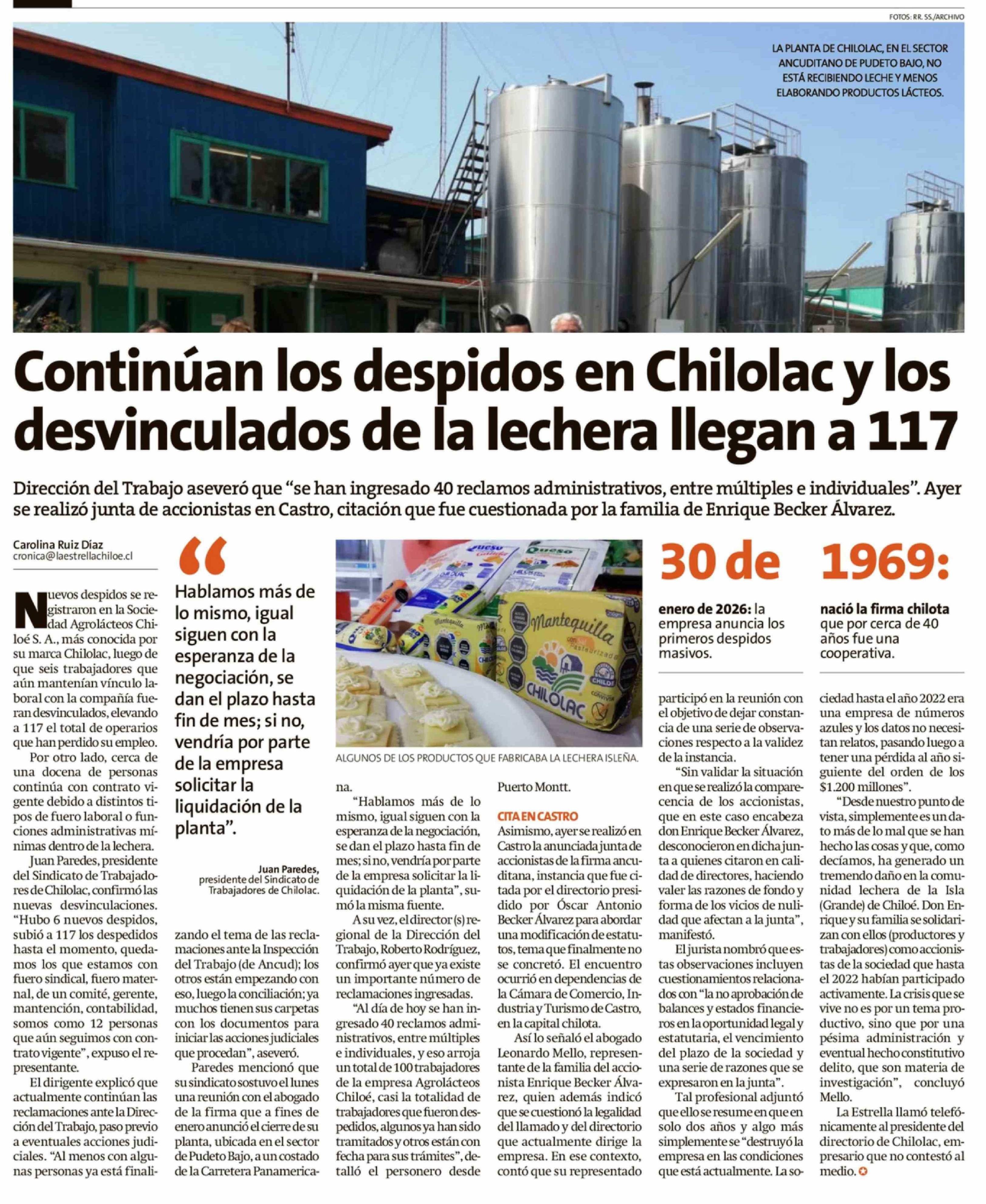 Continúan los despidos en Chilolac y los desvinculados de la lechera llegan a 117 11-03-2026 La Estrella de Chiloé |