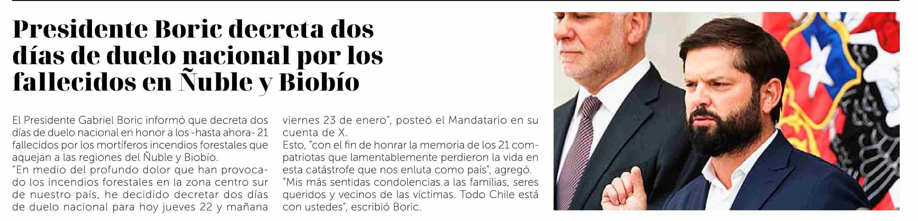 Presidente Boric decreta dos días de duelo nacional por los fallecidos en Ñuble y Biobio 23-01-2026 La Discusión |