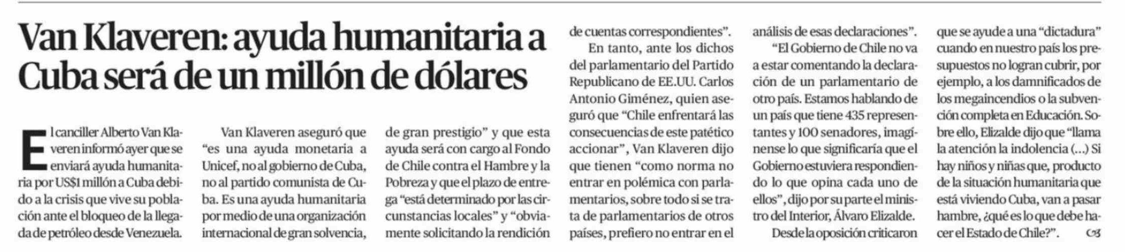 Van Klaveren: ayuda humanitaria a Cuba será de un millón de dólares