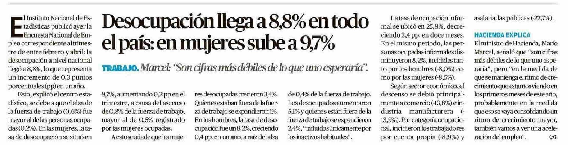 Título: Desocupación llega a 8,8% en todo el país: en mujeres sube a 9.7%