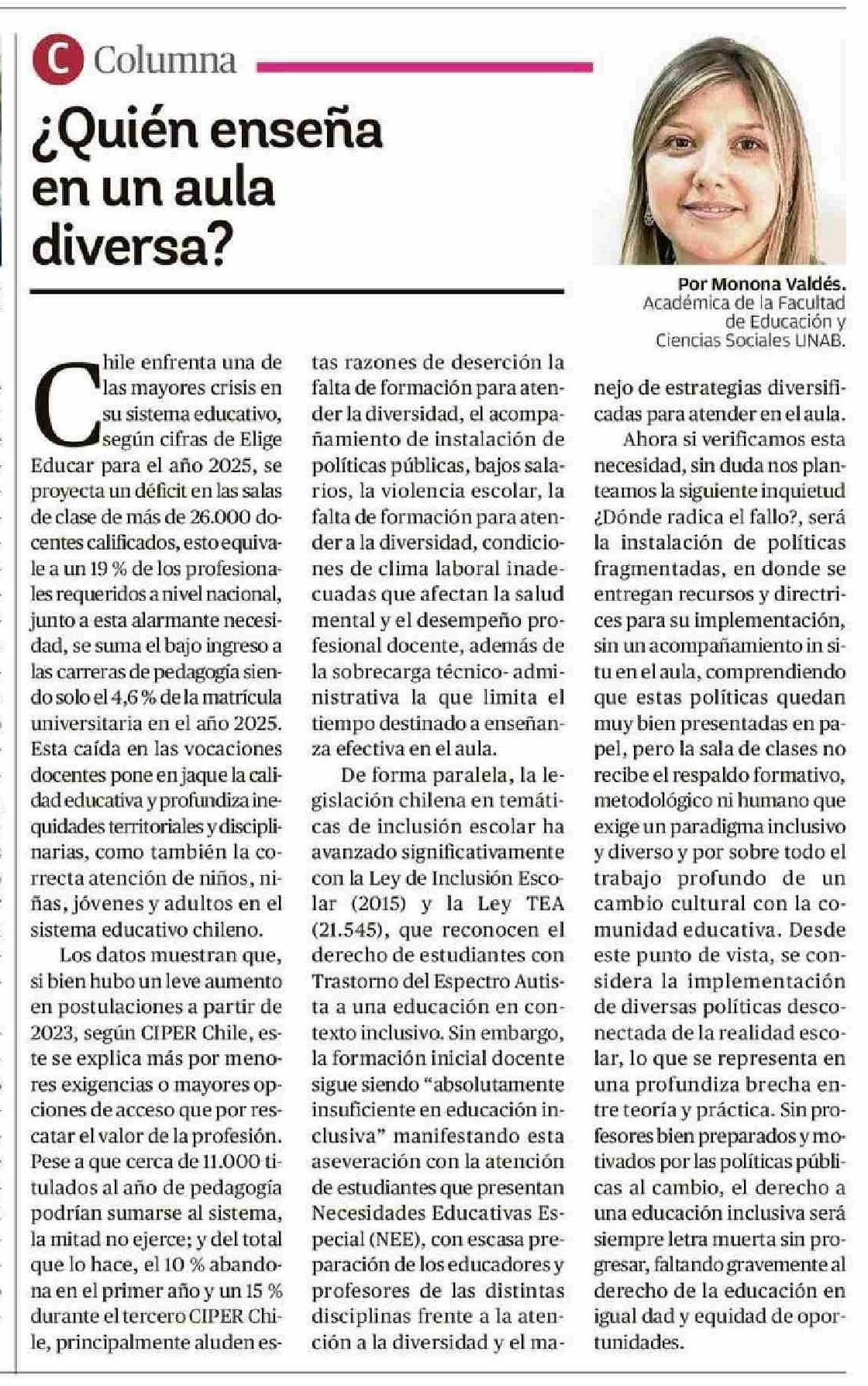 Columnas de Opinión: ¿Quién enseña en un aula diversa? 11-01-2026 Crónica de Chillán |