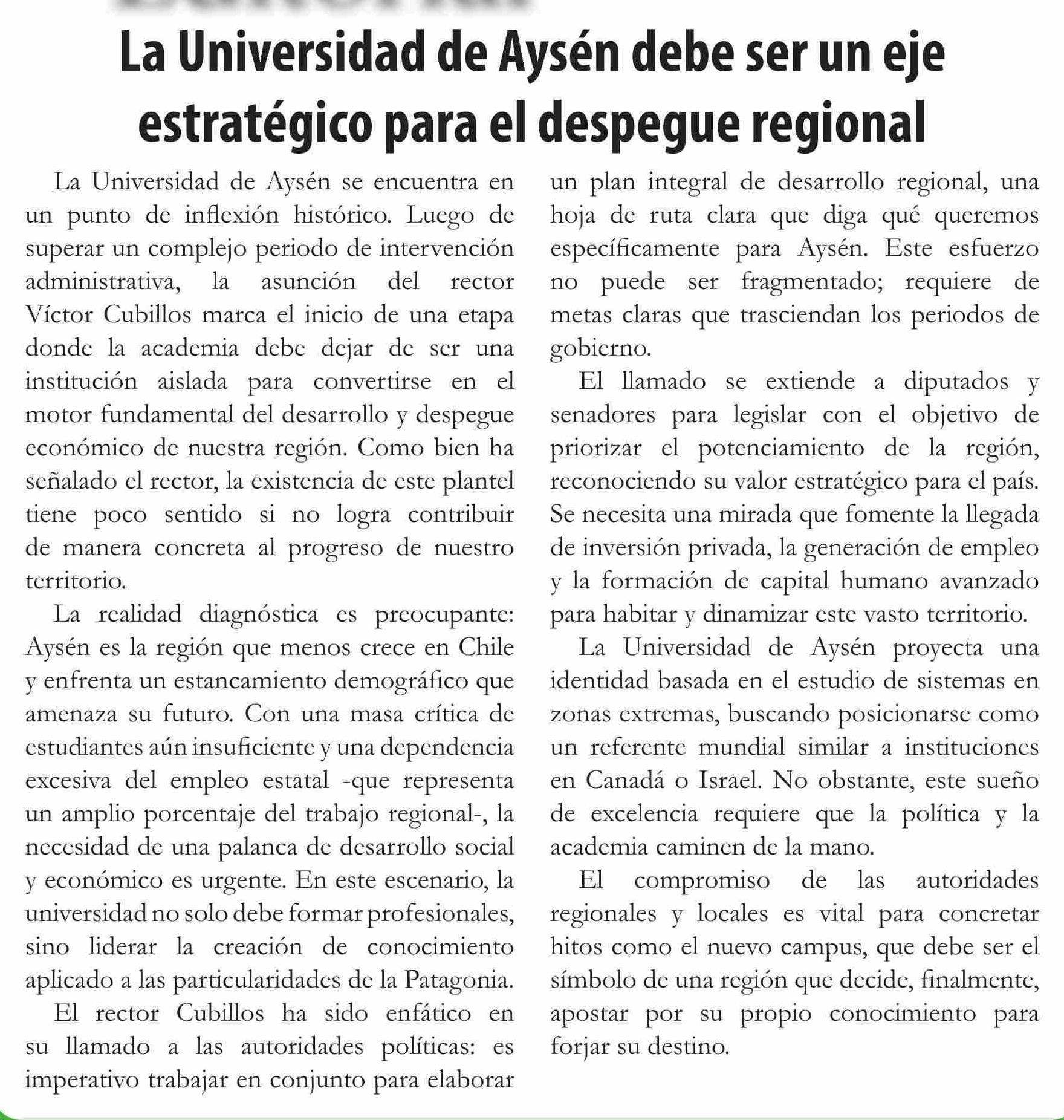 | Título: | Editorial: La Universidad de Aysén debe ser un eje estratégico para el despegue regional |