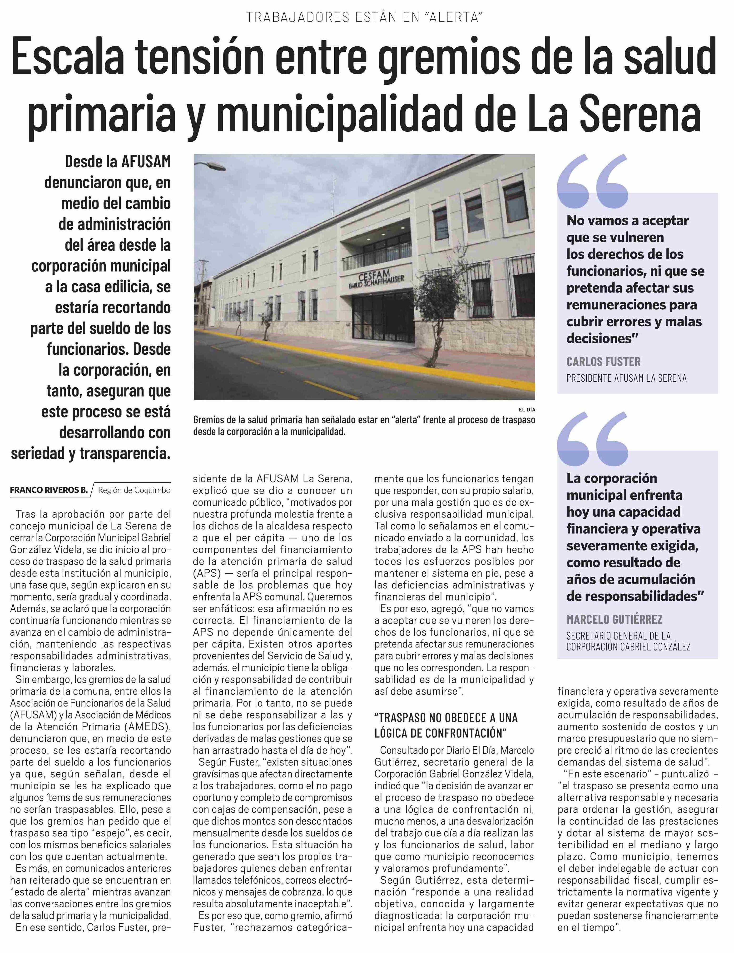 Escala tensión entre gremios de la salud primaria y municipalidad de La Serena 20-01-2026 El Día |