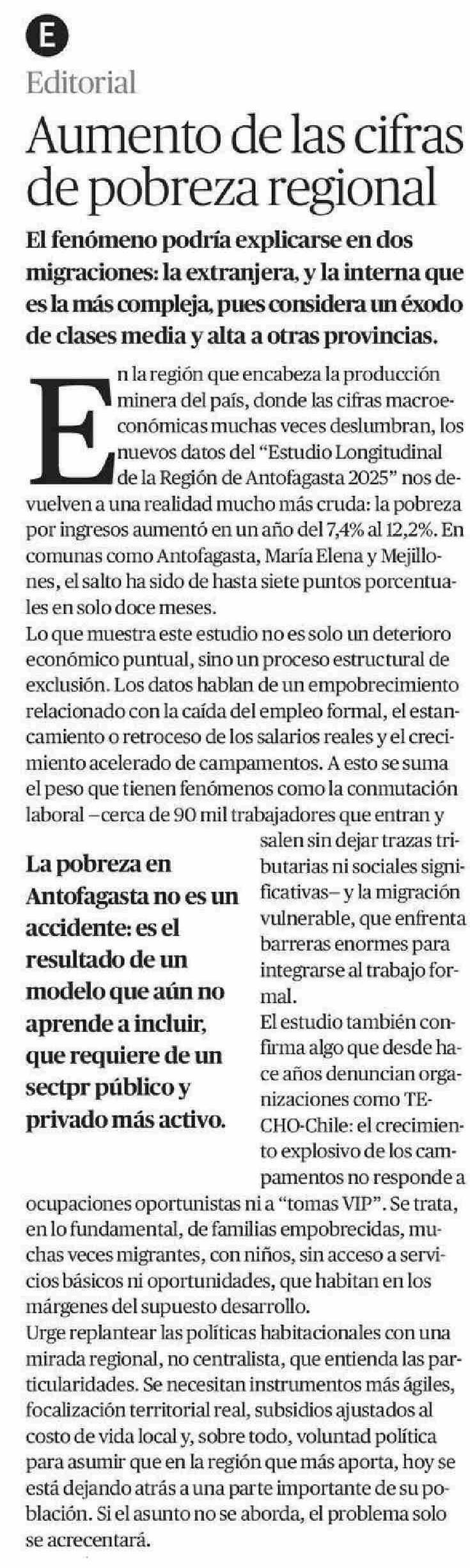 EDITORIAL: Aumento de las cifras de pobreza regional 08-06-2025 El Mercurio de Calama |