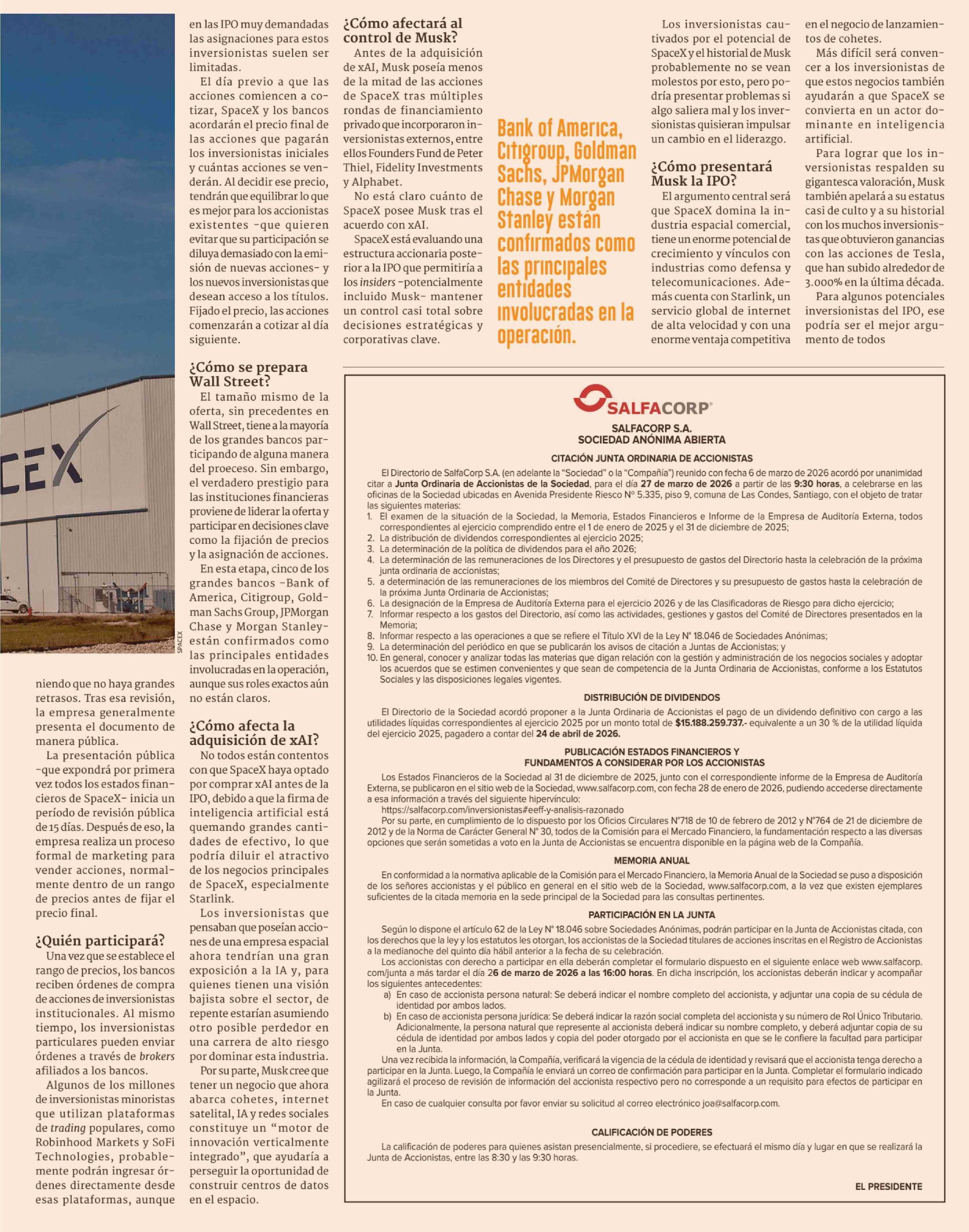 ¿SpaceX vale US$ 1,75 billón? Preguntas clave de cara a la gran apertura bursátil de Elon Musk 11-03-2026 Diario Financiero |