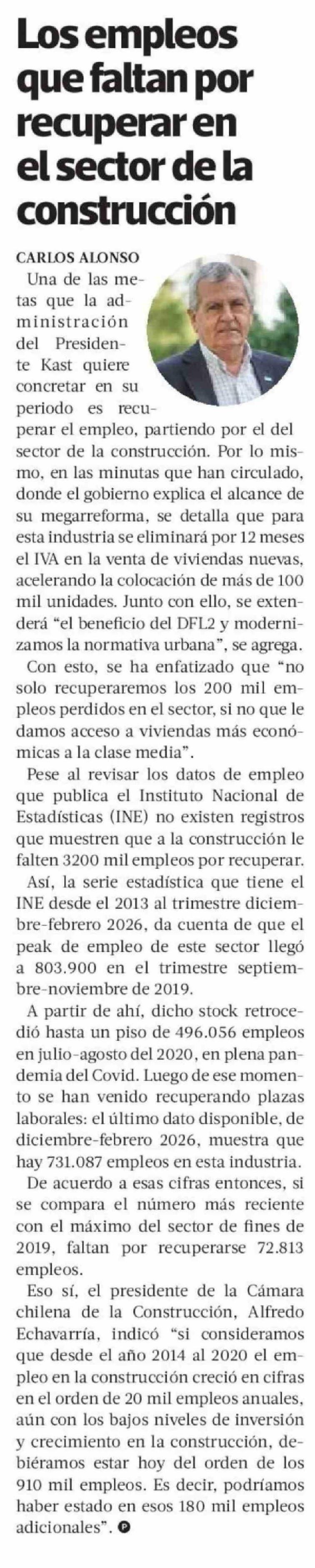 Los empleos que faltan por recuperar en el sector de la construcción 22-04-2026 La Tercera |